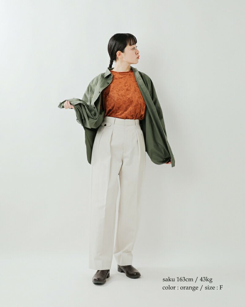 身幅と袖幅にゆとりがあり、体のラインを拾わないシルエットです。着丈は短めで、トレンド感をプラス。ほんのり透け感があって、涼しく着ていただけます。