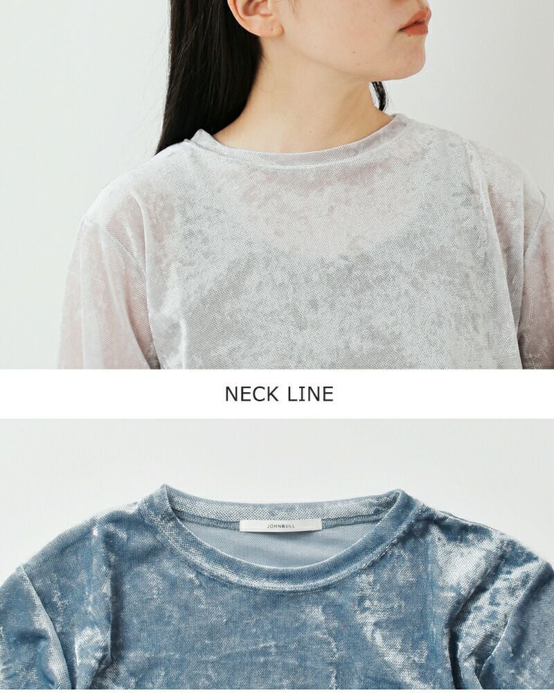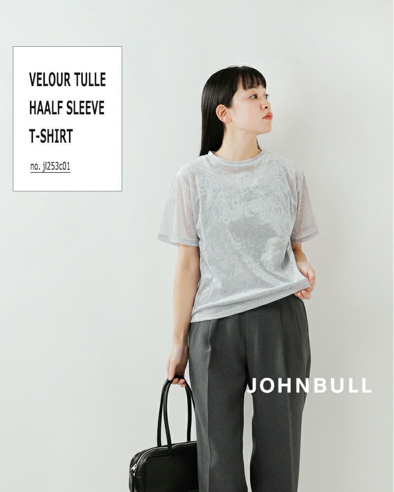 Johnbull(ジョンブル)より、ベロア チュール ハーフスリーブ Tシャツをご紹介します。ベロアチュール素材を使用したTシャツ。程よいシアー感、上品な光沢感のある質感が、暑い季節に大人っぽく着られるアイテムです。肌に馴染むような手触りと、ストレッチ性があるため着心地良く、スタイリングに存在感を放ちます。1枚でもインナーとしても合わせやすく、デニムアイテムに合わせたヴィンテージライクな着こなしがおすすめです。
