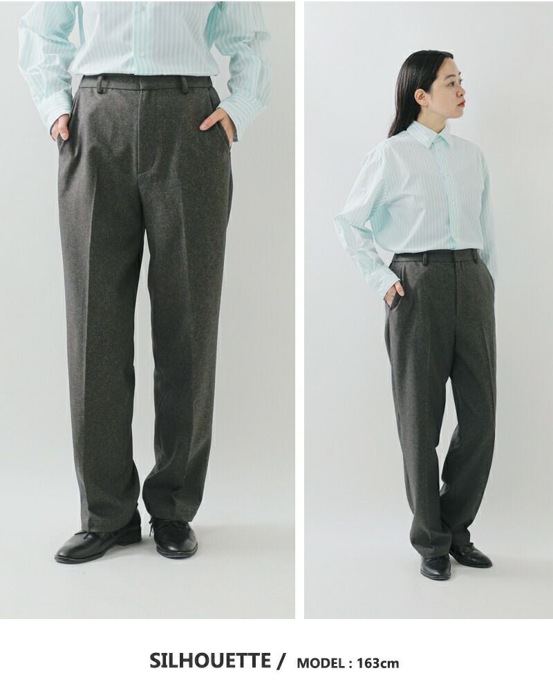 ウールのような見た目ですが、ポリエステル100%の扱いやすい素材です。表情豊かな生地感でスタイリングに奥行きをだします。滑らかな素材でチクチク感もなく着心地が◎。ケアに優れた素材を使用しているのでお手入れの心配もありません。