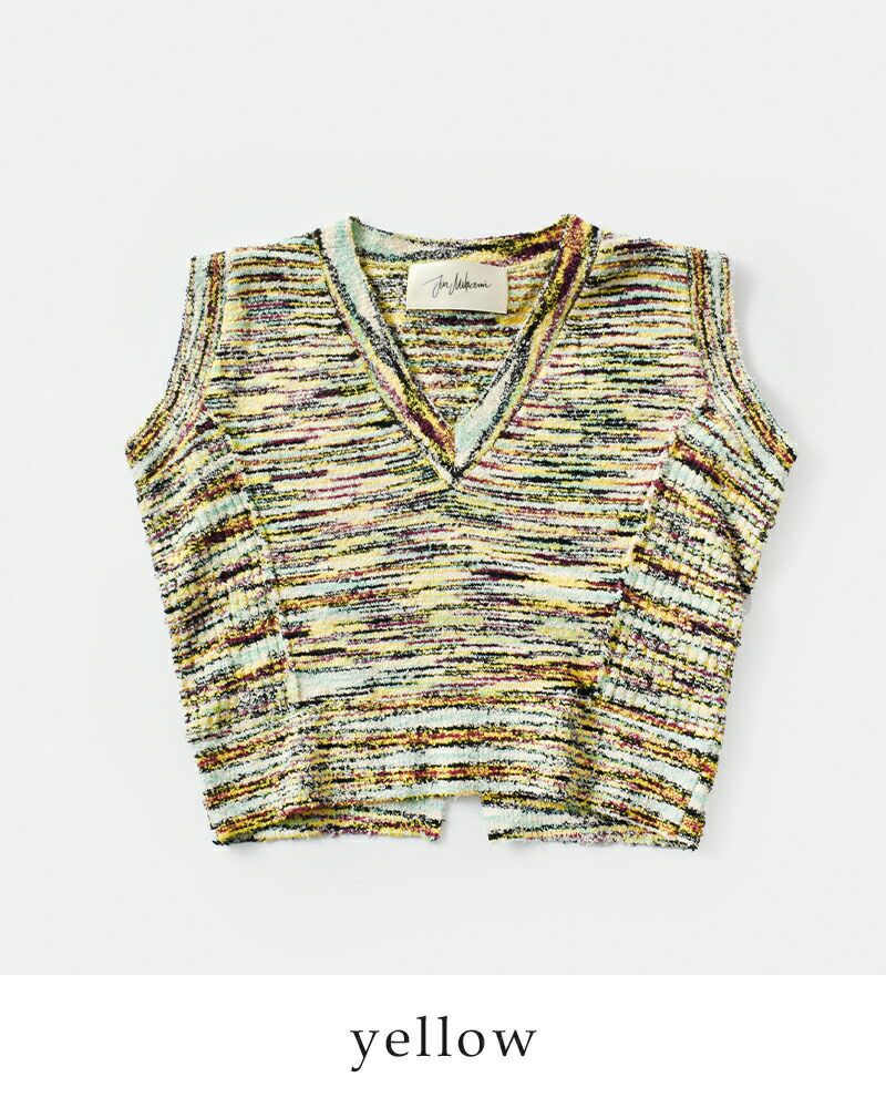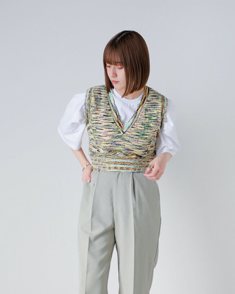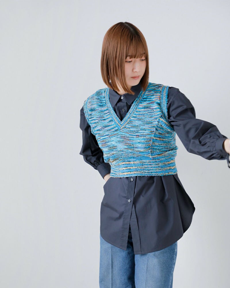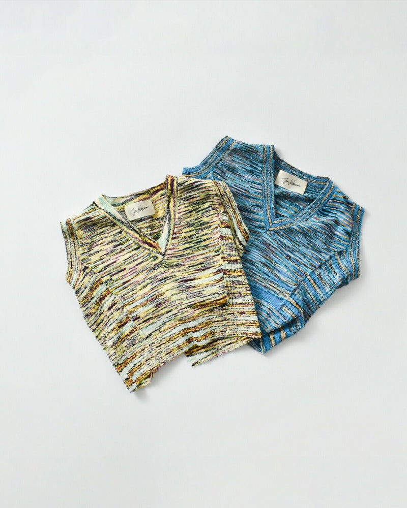糸の撚りによるたわみを活かしたファンシーヤーンに段染めを施し、オリジナルで作り上げた一枚。紙吹雪のように舞う5色が織りなす美しいミックスカラーが特徴で、着るだけでコーディネートに彩りを添えます。