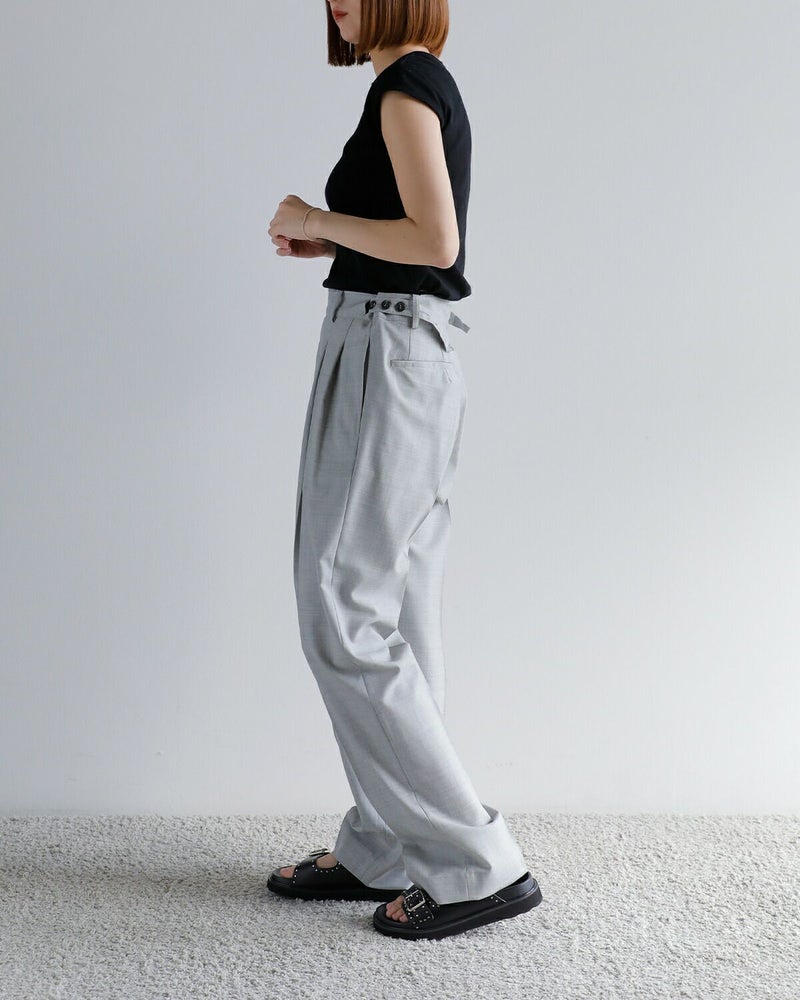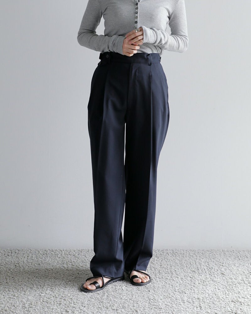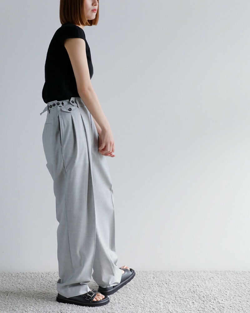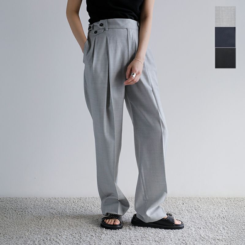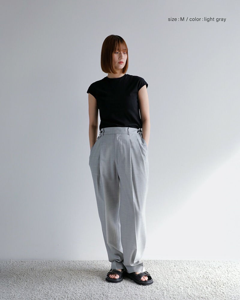 フラットな表面仕上げが特徴で、さらりとした肌触りと清涼感のある生地が、暑い季節でも快適な着心地を提供します。タック入りのシルエットは適度なゆとりを持たせながらも、センタープレスが美しい脚のラインを演出。ウエストにはアジャスターボタンを備え、サイズ調整が可能なため、自分に合ったフィット感を楽しめます。