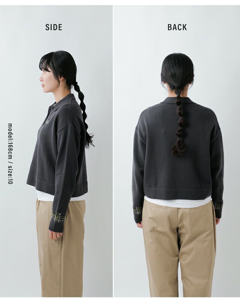 ベースに綿糸を使用し、袖口にはアルパカ混紡糸を切り替えであしらったスキッパーニットシャツ。