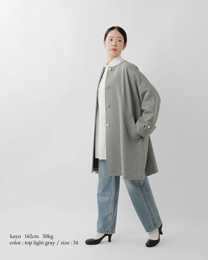 首元はシンプルなノーカラーデザイン。すっきりとした首回りは巻物とも好相性。フラットなゴールドに輝くボタンが、きりりと全体の印象を引き締めます。