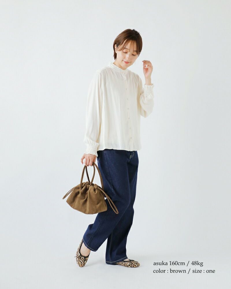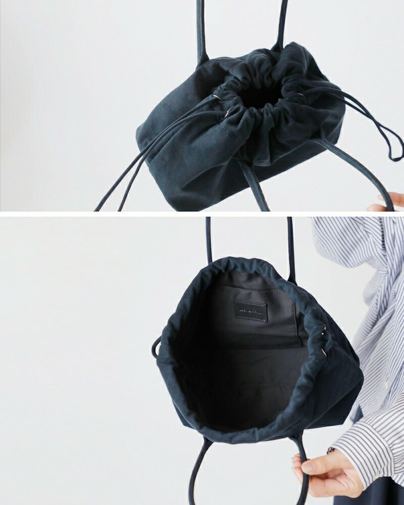 巾着紐を閉じた時の、ころんとした丸いフォルムが可愛らしいミニバッグ。入れ口は紐を絞らず、開けたままでも持つことが出来ます。