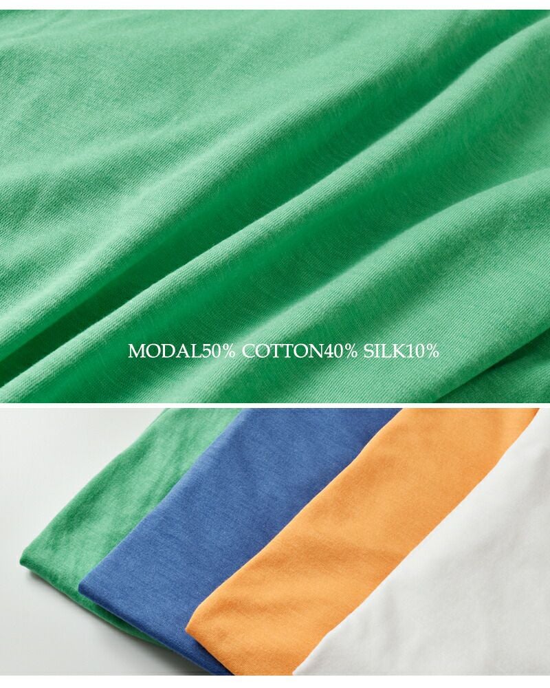 モダール(レーヨン)50% コットン40% シルク10% 優れた吸湿性を持つモダールに、シルクとコットンを加えた生地。とても柔らかな肌触りと滑らかさがやみつきになります。シルクの光沢が上品で、日常着にほんのり特別な印象を感じさせます。 ■モダールはオーストリアのレンチング社が生産するもので、ブナを原料とした繊維(レーヨン)です。同社は、製造工程から有害廃棄物を一切出さないという、地球環境にやさしい生産を行っていることでも注目されています。
