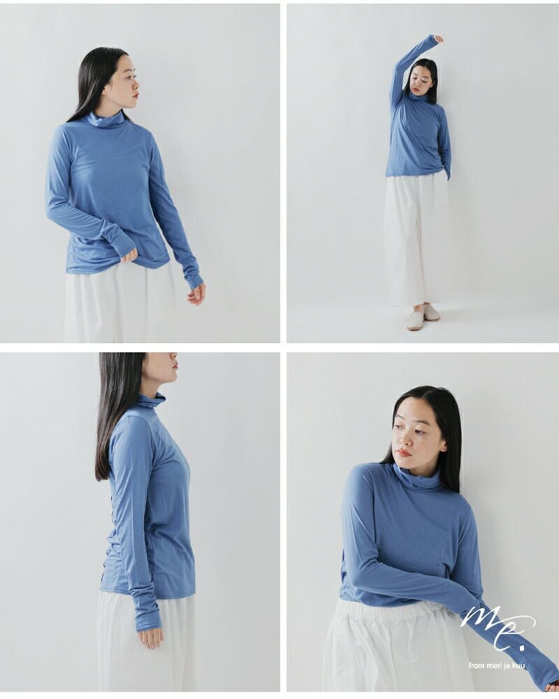 me.(ミードット)より、モダール タートルネック プルオーバーをご紹介します。モダールの優れた吸湿性とシルクの光沢やなめらかな質感に、さらにコットンのカジュアル感も加わった、3素材を混紡した素材を使用。繊細な空気をまとったようなミードットの定番素材です。テロンとして滑らかな肌触りが心地良くて、薄手でさらりと着やすいカットソー。差し色になるようなカラーも揃えていますのでインナーに着てチラ見せも楽しんでもらえたらと思います。