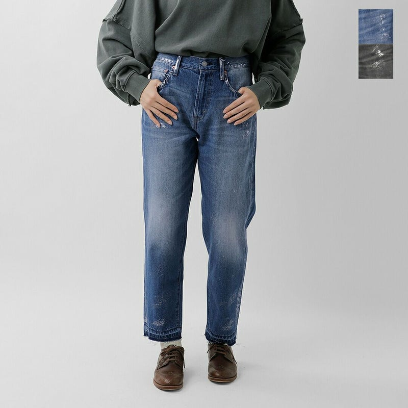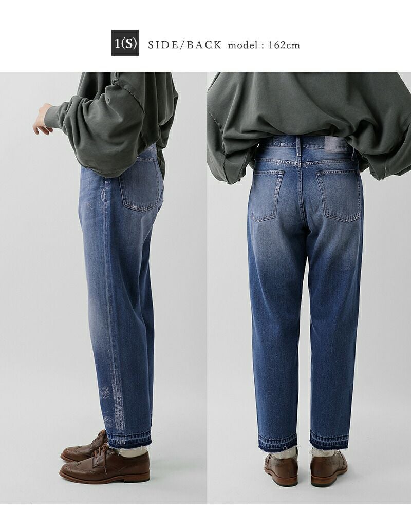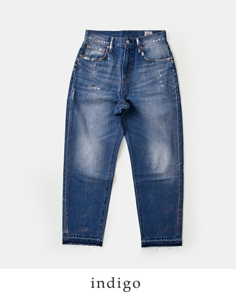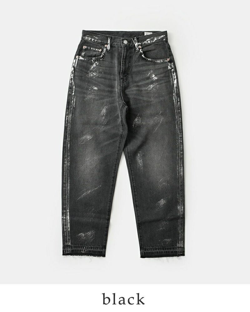 ・右脇にコインポケット付き。 ・フロントはジッパーフライ仕様で着脱もスムーズ。 ・後ろのスクエア型の箔プリントがポイント。 ・加工後にほどいたカットオフ始末の裾が程良いアクセントに。