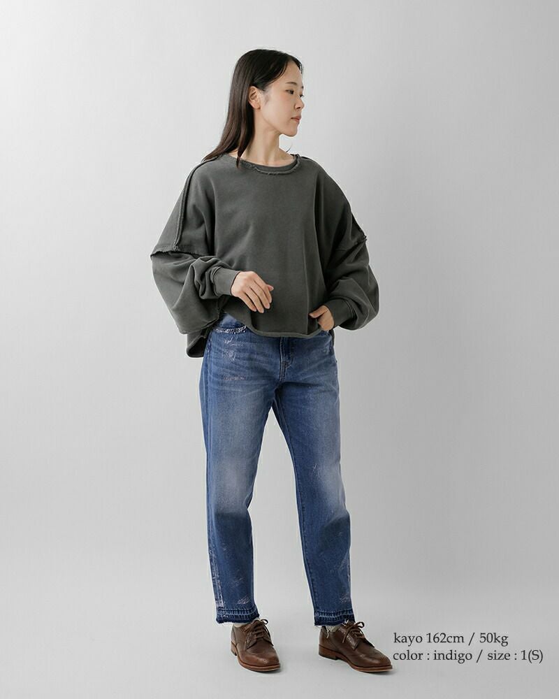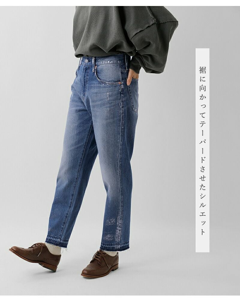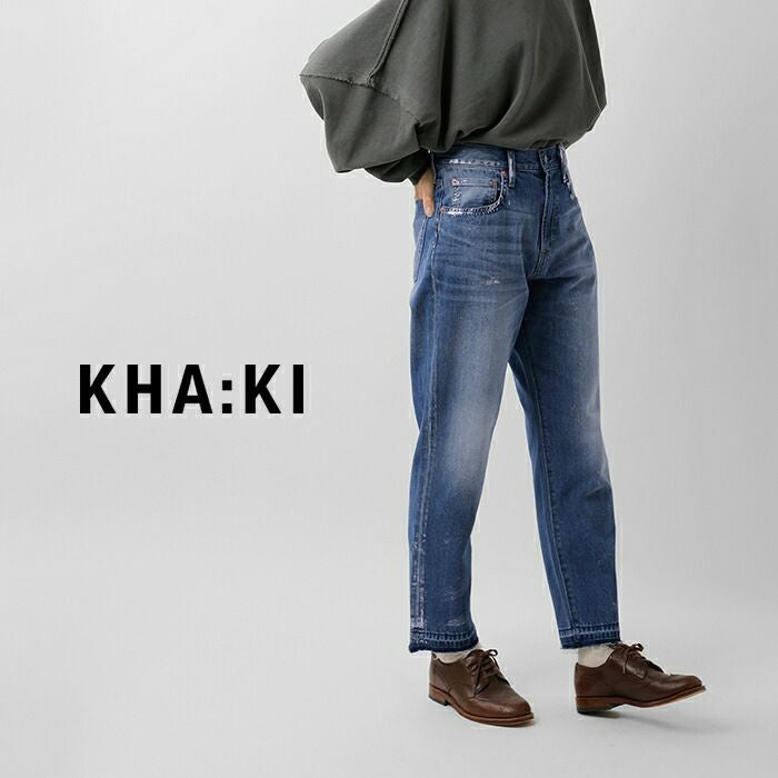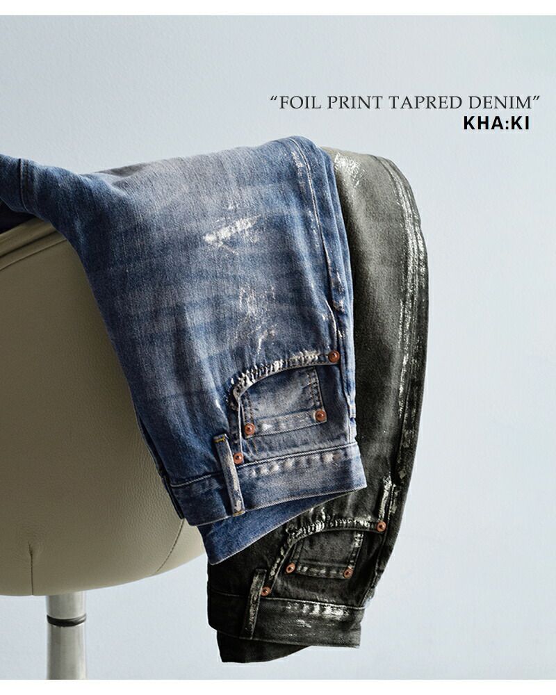 kha:ki(カーキ)より、デニム 箔プリント テーパード パンツ “FOIL PRINT TAPRED DENIM”のご紹介です。MID RISE TAPRED DENIMのシルエットをベースに手作業で箔プリントを施したインパクトのあるアイテムです。シルバーの箔を縫い目に沿って均一にならないようにニュアンスをつけながら1本1本手作業でプリントしています。オーセンティックな5ポケットデニムのディティールをベースに腰回りにゆとりをもたせ、裾に向かってテーパードさせたコーディネートしやすいシルエットに仕上げました。加工後にほどいたカットオフ始末の裾が程良いアクセントになっています。10ozの程良い厚みのデニムは長い期間着用していただけます。