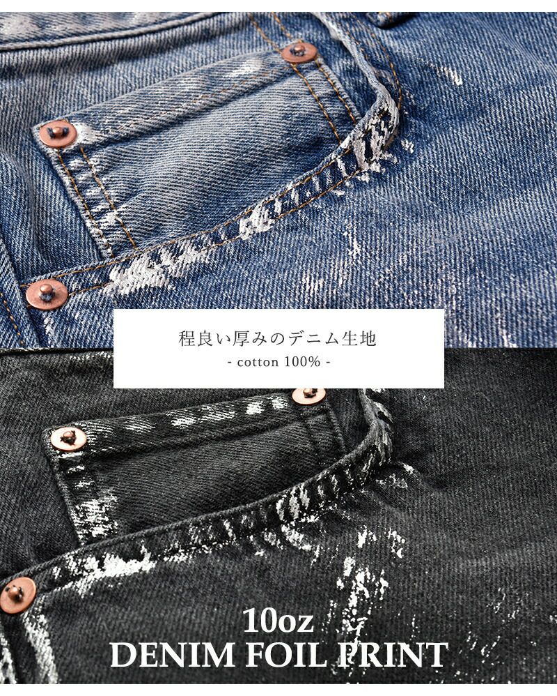 着るほどに馴染む10ozデニムで、長く愛せる仕上がりです。ほどよい厚みでロングシーズン活躍します。手作業で箔プリントを施したインパクトのあるアイテムです。