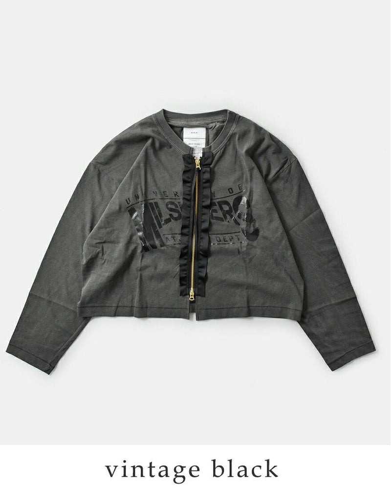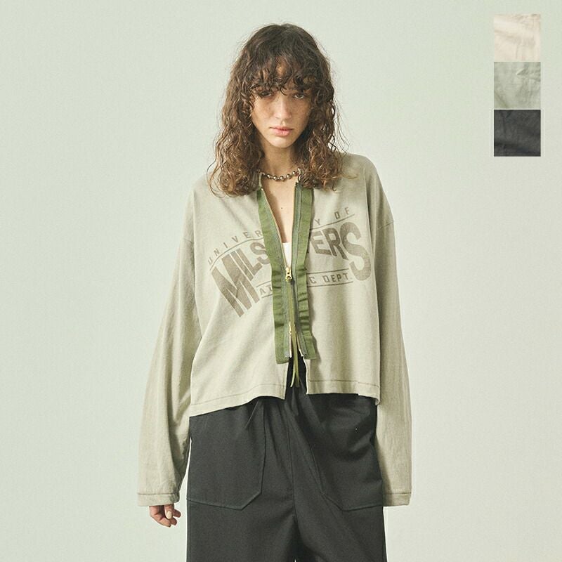 古着のTシャツを思わせるヴィンテージ調のプリントボディをベースに、フロントにはジップをプラス。Tシャツのラフさを残しながらも、カーディガンとしての使いやすさも兼ね備えた1着です。