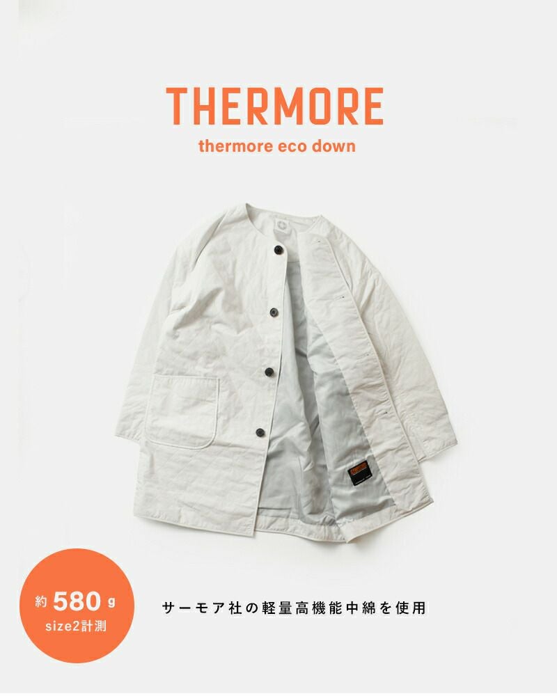 イタリアミラノ発の老舗中綿ブランド「サーモア社」が手掛ける、ハイスペック中綿「サーモア」を使用。 ダウンを超える暖かさとして注目されている新しいエコダウンです。 サーモア中綿素材は、従来品より空気層を大幅に増加しており、低密度・低重量で多くの空気を含んだ素材。裏地にthermore eco downのタグ付きです。