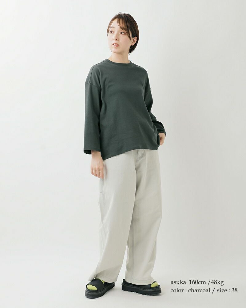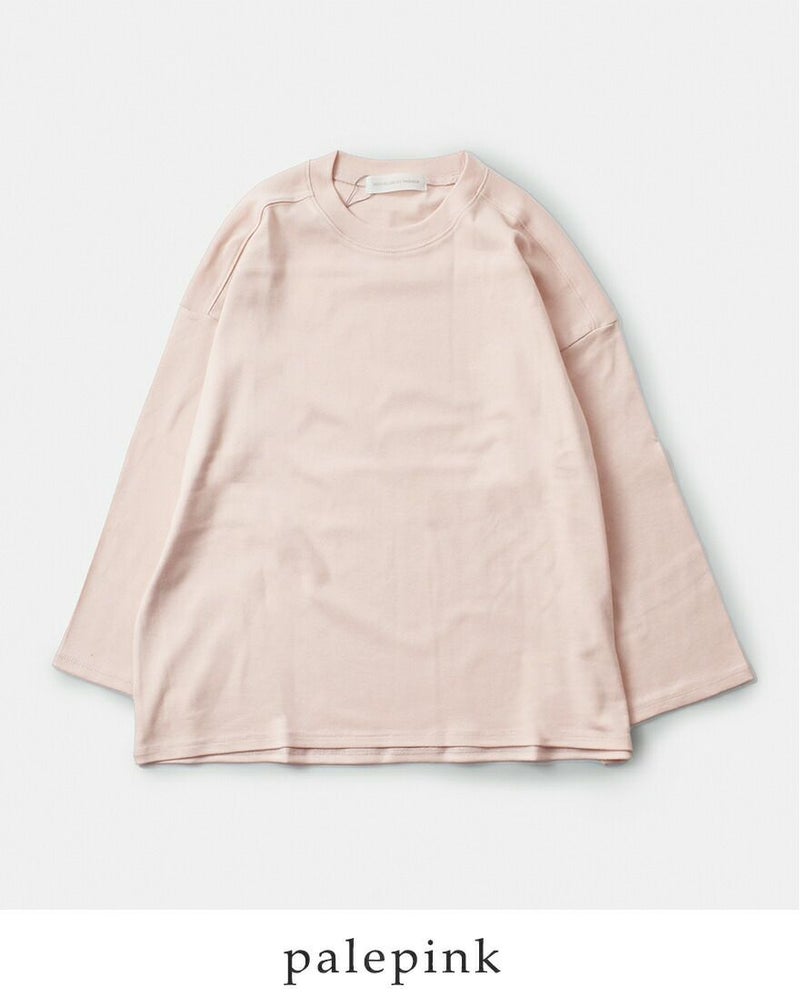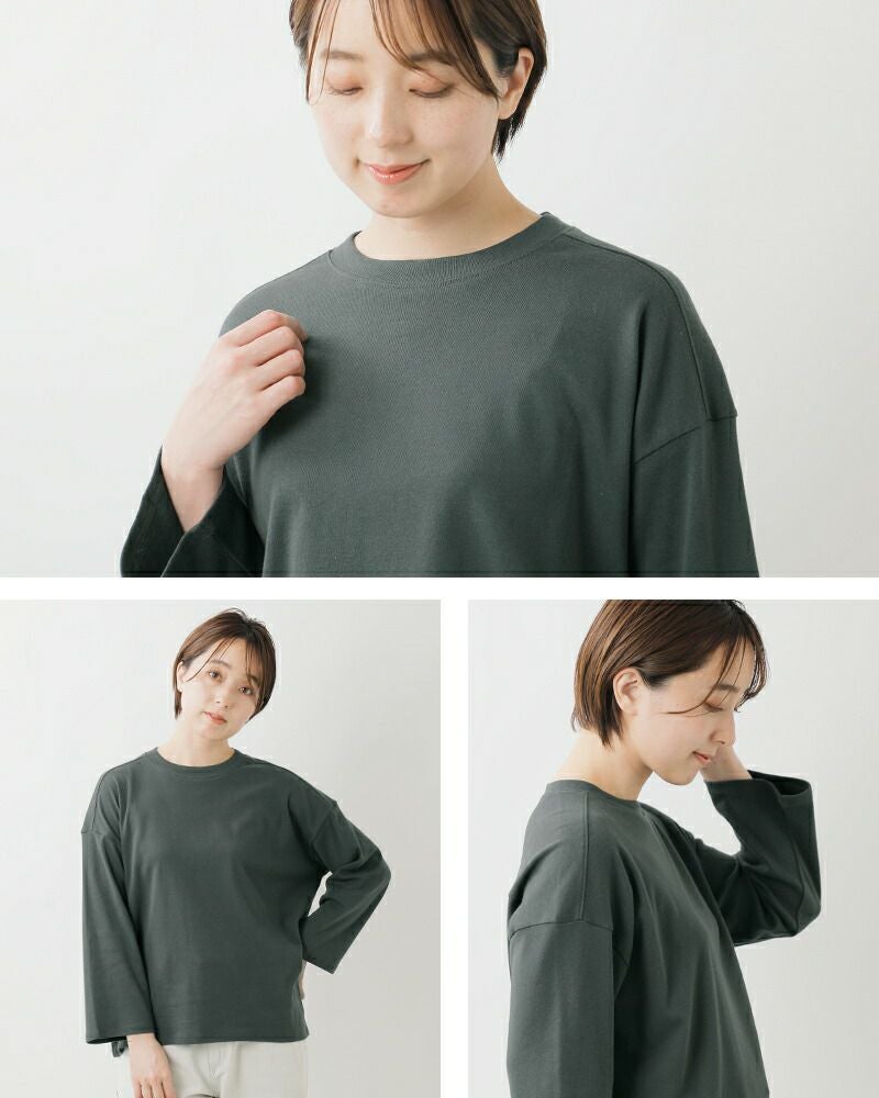 首元のリブの密度が大人っぽさの秘密。袖口や裾は丁寧なダブルステッチになっています。肩からお袖にかけてもすっきりしているので上からジャケットを羽織ってもごわつかず軽快♪