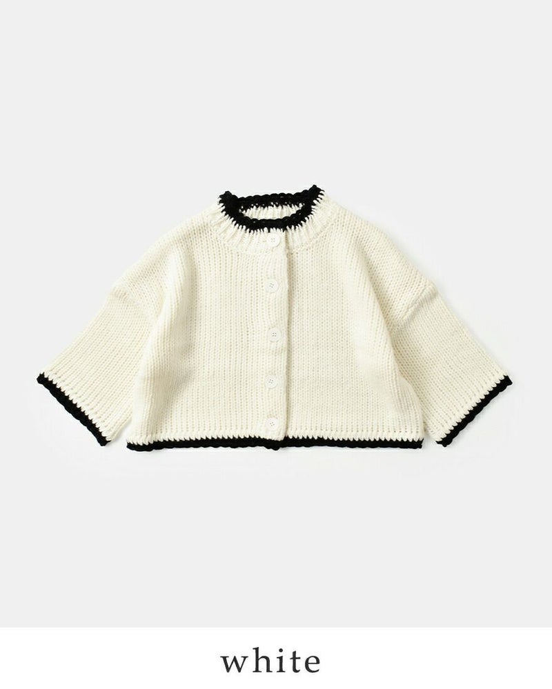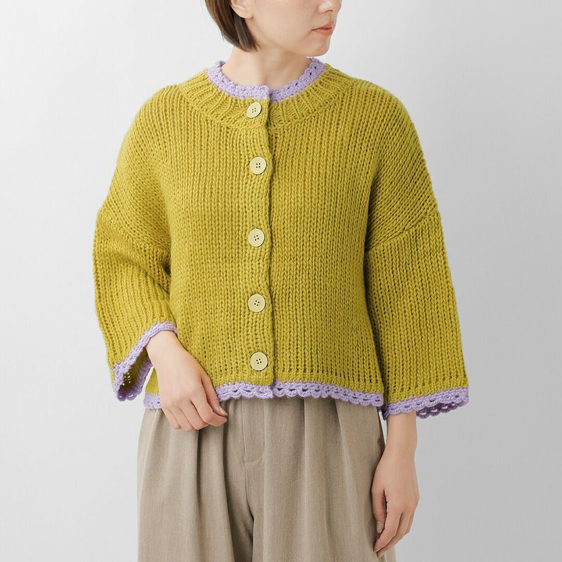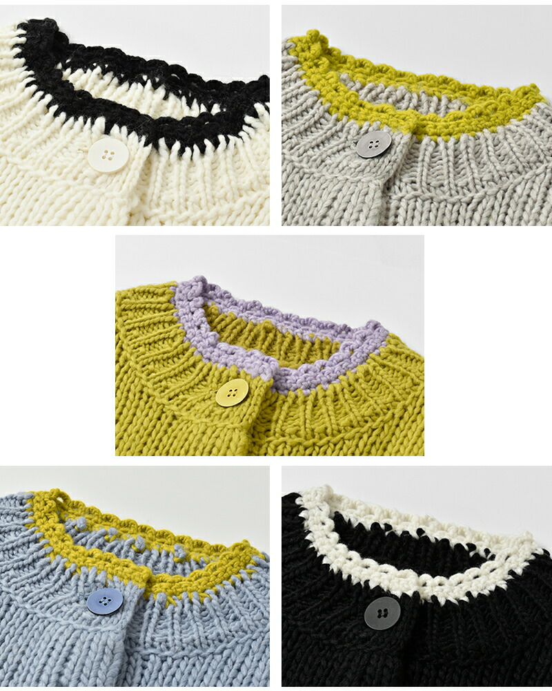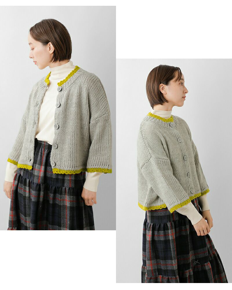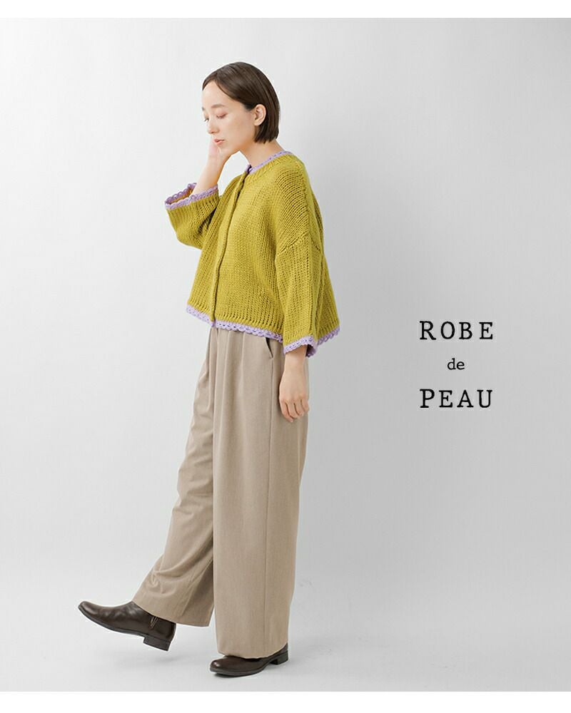 ROBE de PEAU(ローブデポー)より、アルパカ ウール ボトルネック カーディガン “JOU JOU BOTTLENECK CARDIGAN”のご紹介です。襟・袖・裾のハンドメイドのスカラップが暖かみのあるデザインのカーディガン。おしゃれな配色がアクセントになり、明るいカラーが顔映りも心も華やかにしてくれます。大きめのボタンが可愛らしさを添え、見た目以上に軽い着心地も魅力の一枚です。