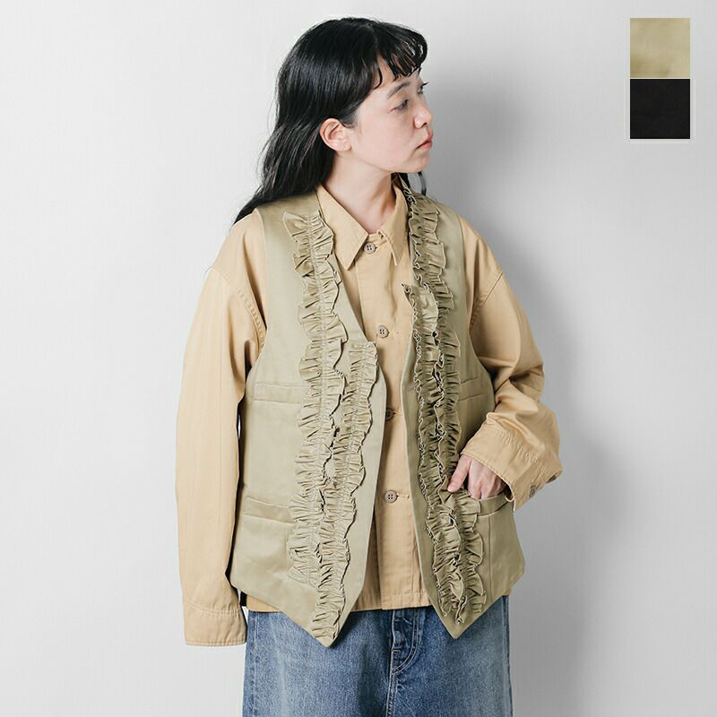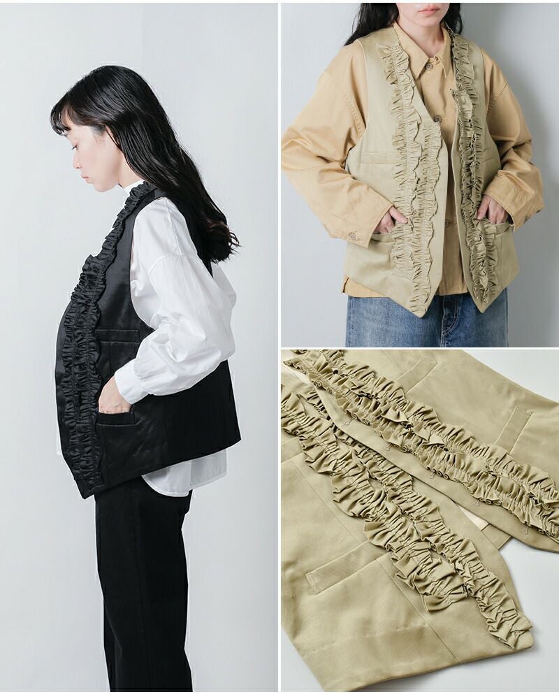 クラシカルなウエストコートをベースに、フロント全体にランダムにあしらわれたフリルが印象的な一着。甘さを抑えたデザインで、ヴィンテージライクにもモードにも着こなせる仕上がりです。生地には、光沢とハリのある上質なコットンチノクロスを採用。レイヤードスタイルに軽やかさと個性を加えてくれます。