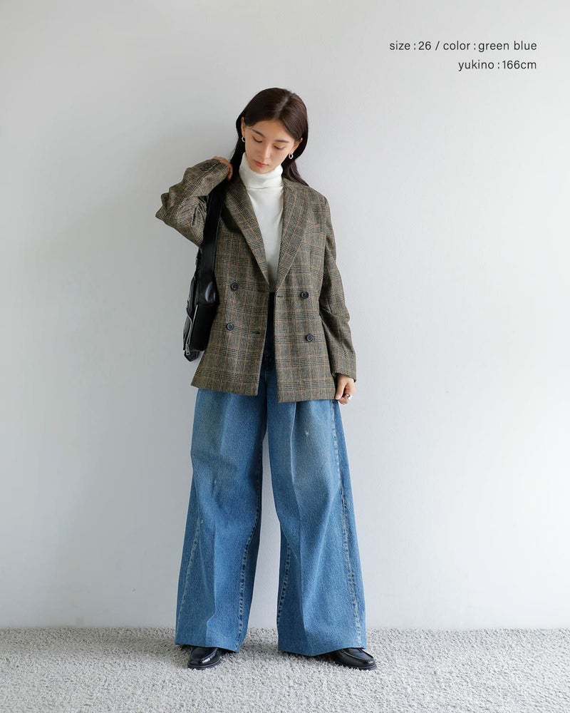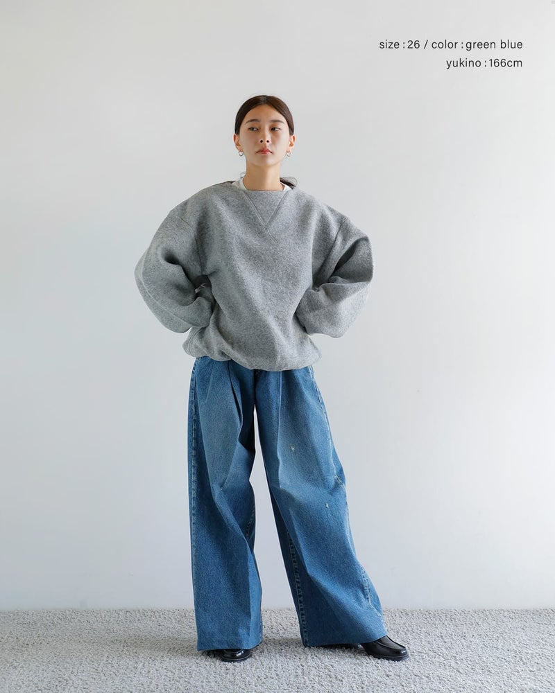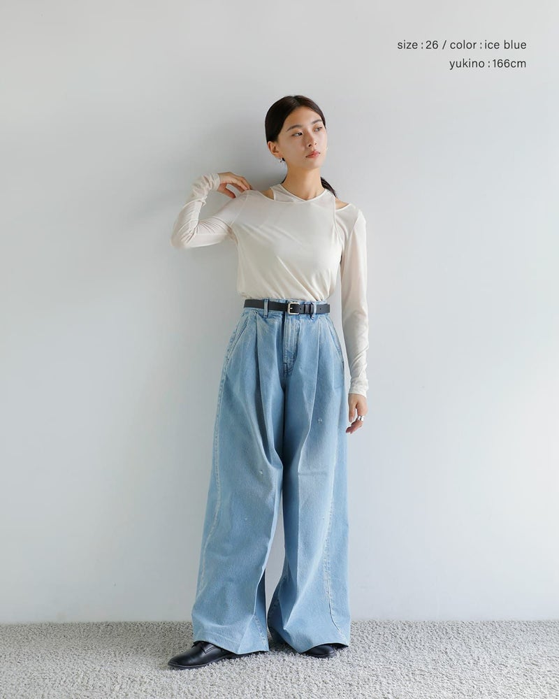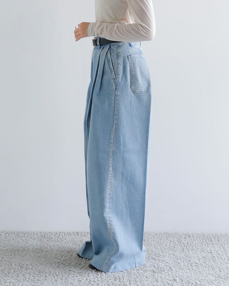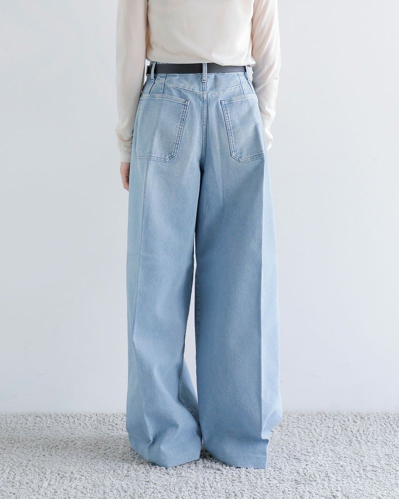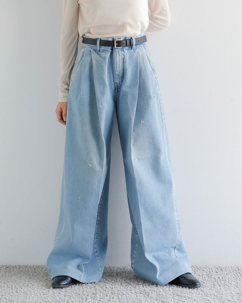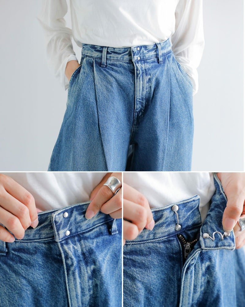 ウエストは特徴的な前カンとファスナーでの開閉となっています。また、深いタックにより、美しく広がり、様々な着こなしが楽しめるワイドジーンズです。