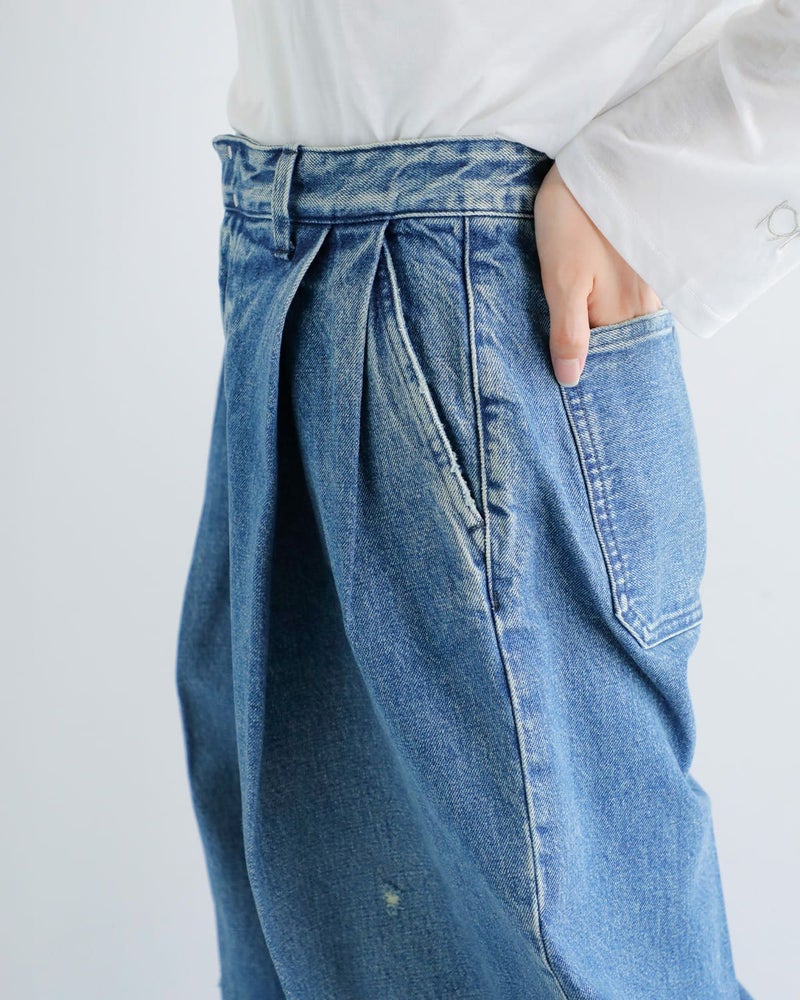 袴のように大胆にタックの入った広がりのあるシルエットが特徴の “HAKAMA JEAN TROUSERS”。