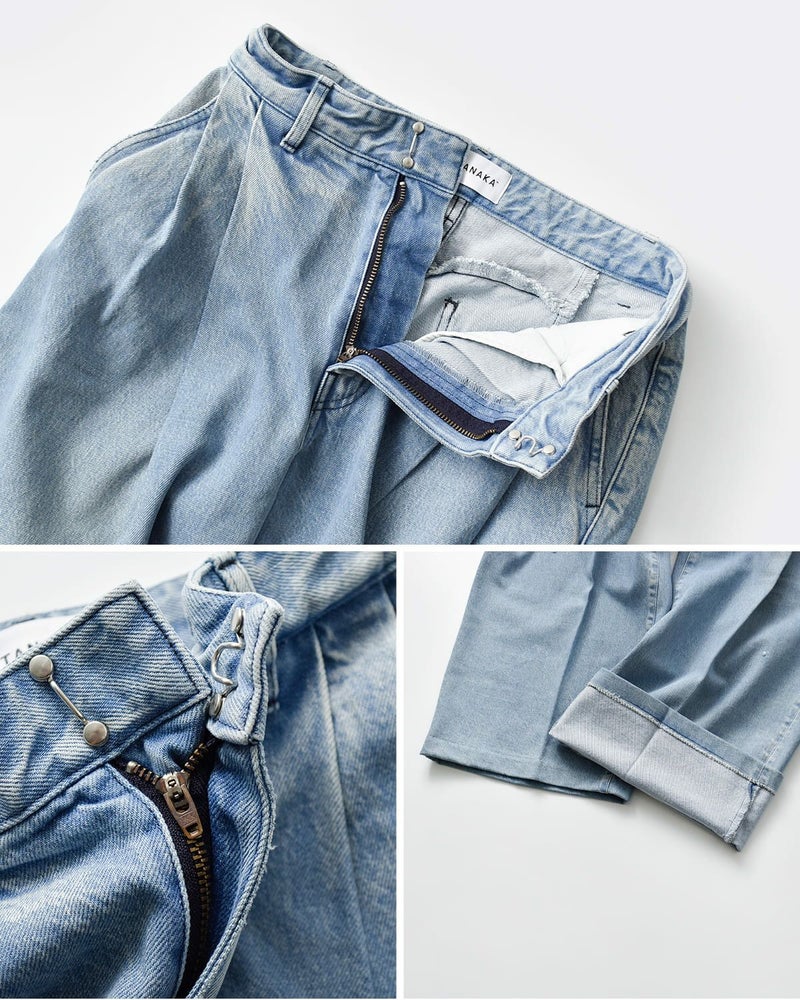 上品なフォルムに対照的な程よいダメージ感と細めのベルトループなどTANAKAらしい細部にまで拘った個性的なデザインながらオーセンティックなデニム素材で長く愛用いただける商品です。余計な装飾を省いたミニマルな仕様で、合わせるトップスやシューズを選ばず、幅広いスタイルに溶け込む一本をぜひご覧ください。