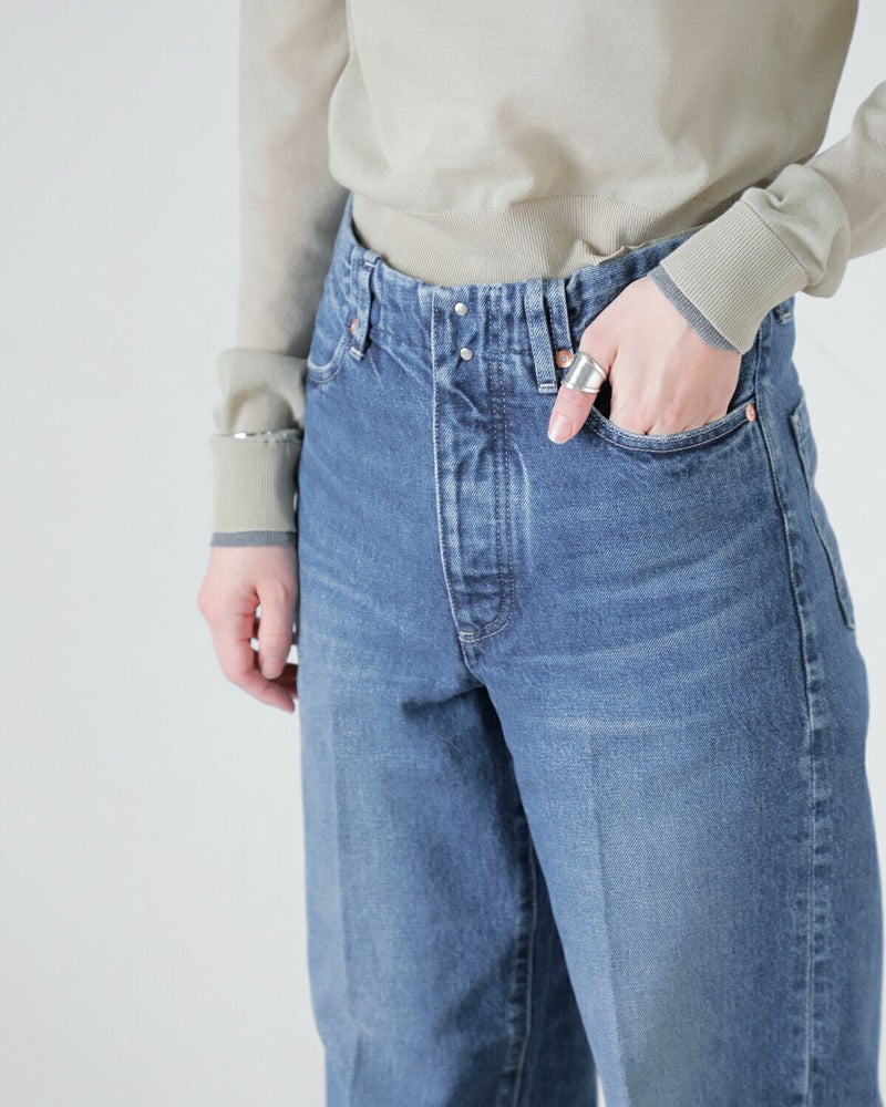 さらに、岡山の熟練職人によるユーズド加工を施し、何年も穿き込んだような味わい深いブルーに。横糸にはリサイクルコットンを含み、穿くほどに柔らかく肌に馴染んでいきます。