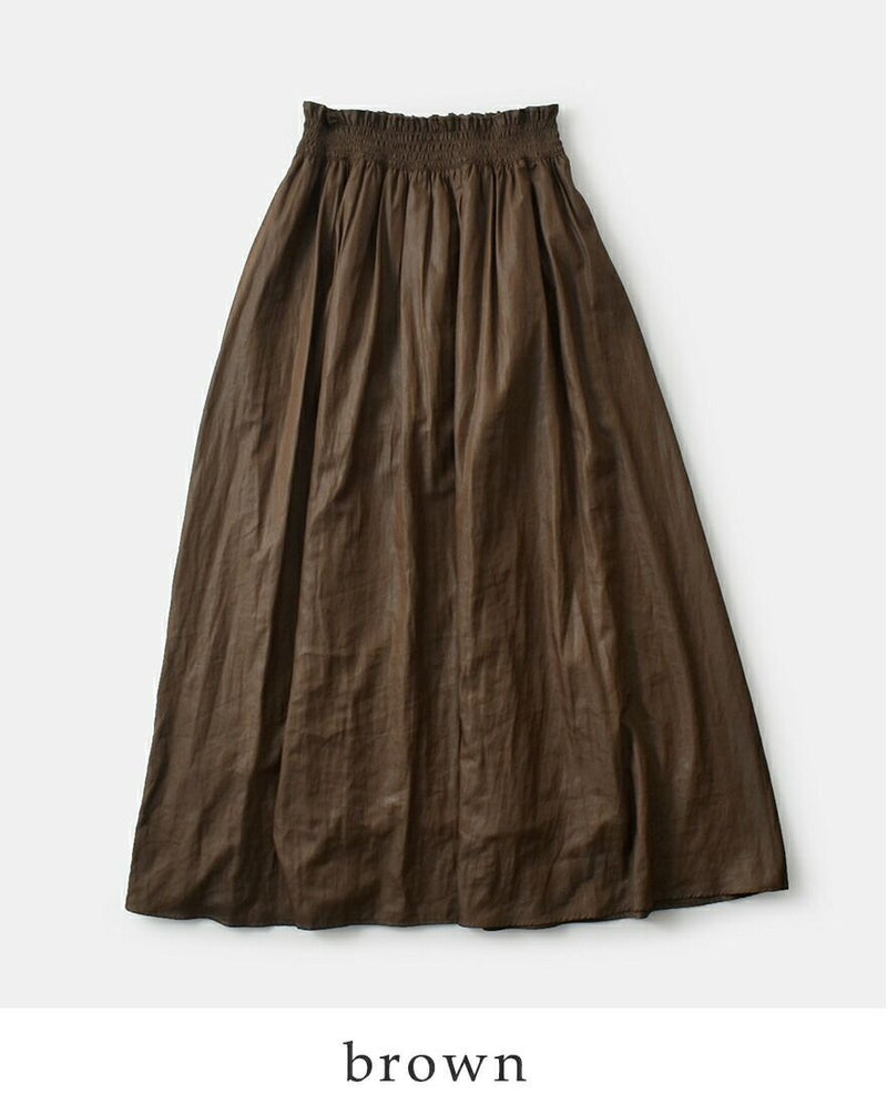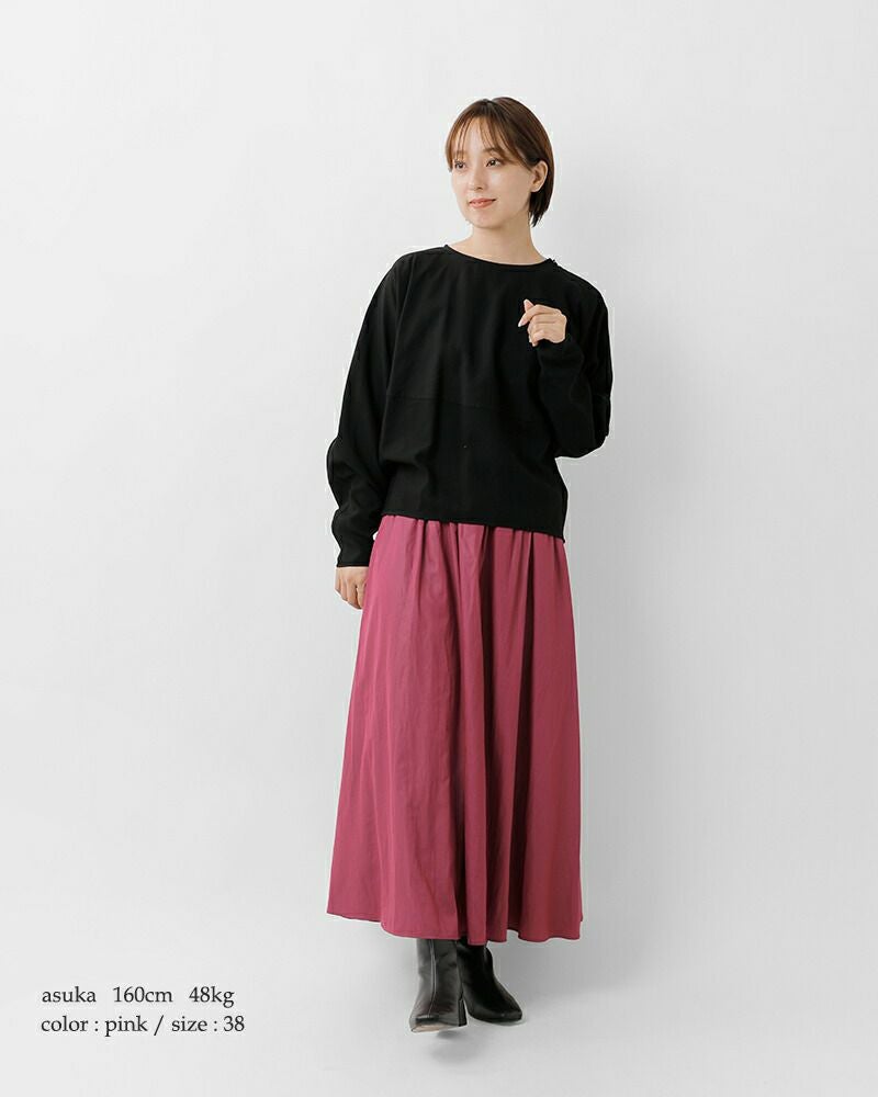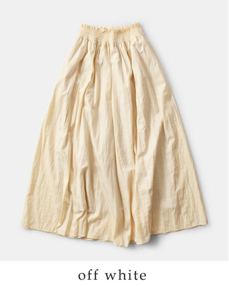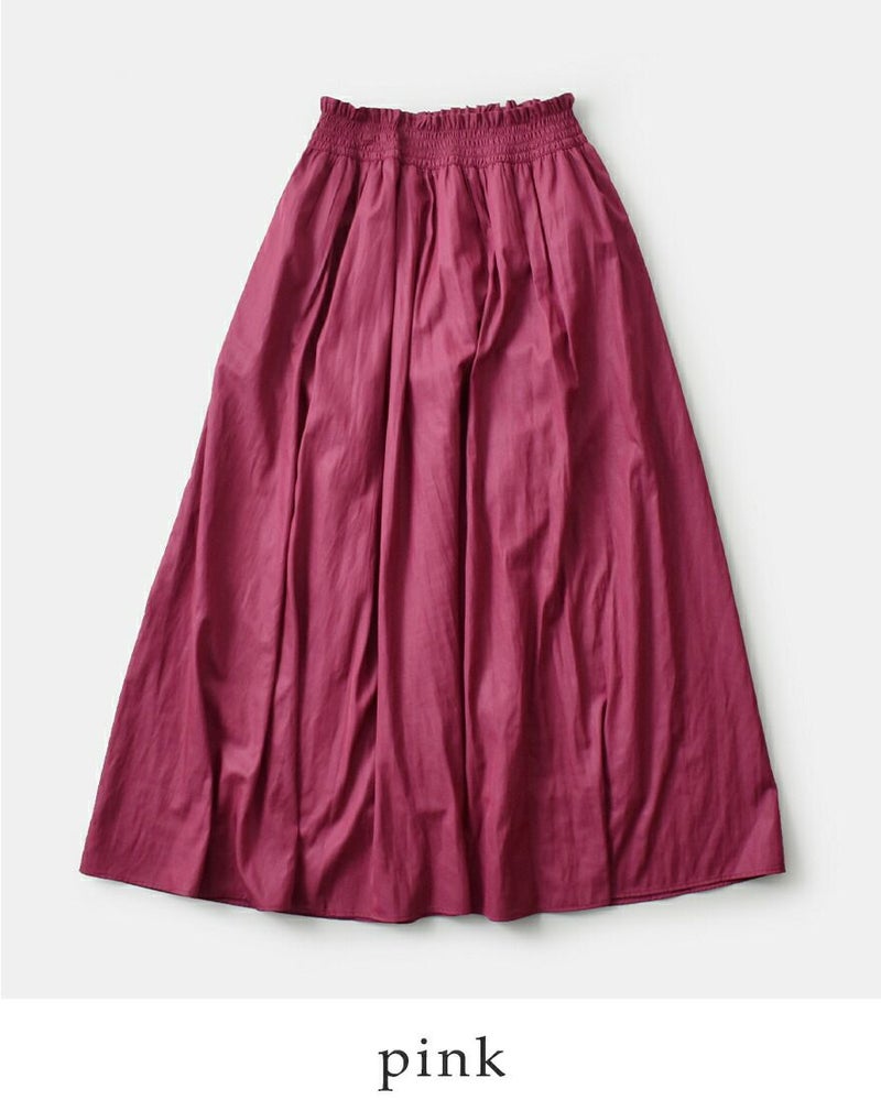 ウエストはぐるりとシャーリング仕様で、優しくフィット。シンプルなデザインの中にさりげないアクセントを添えています。