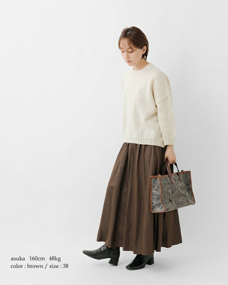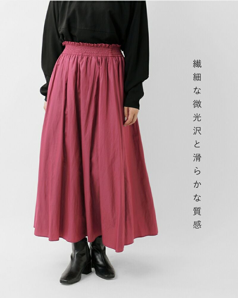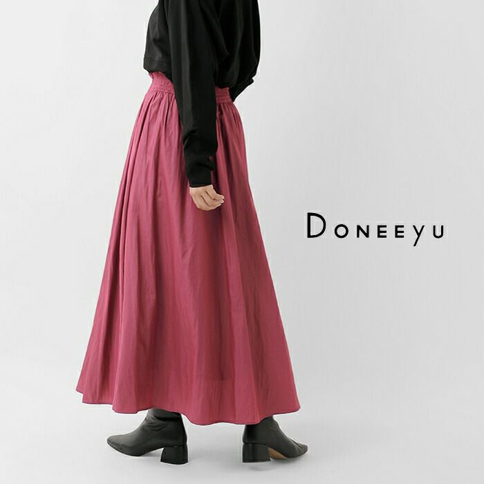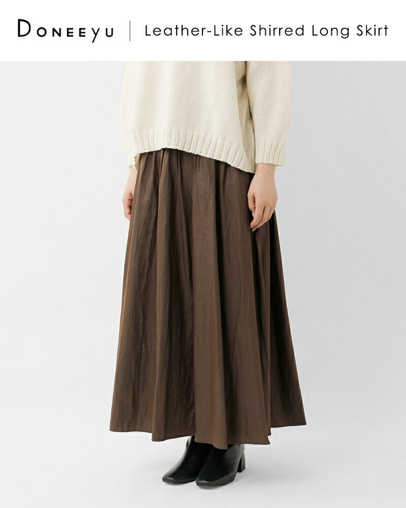 DONEEYU(ドニーユ)より割繊レザーライク シャーリング ロング スカートのご紹介です。繊細な微光沢と滑らかな質感が魅力の割繊生地は、まるでレザーのような表情を持ちながらも驚くほど軽やか。ウエストにはたっぷりとシャーリングを施し、程よくボリュームのある美しいフレアシルエットを実現しました。すっきりと見せつつも、動きのあるシルエットで着こなしにリズムを加え、シンプルなトップスと合わせるだけでスタイルが決まる1枚。上品な光沢感と華やかなカラーで、カジュアルからお出かけまで幅広く活躍します。