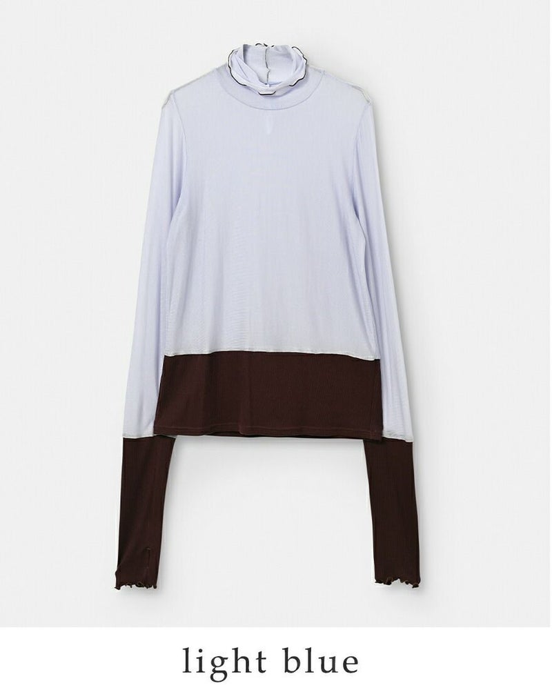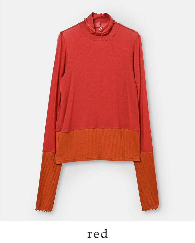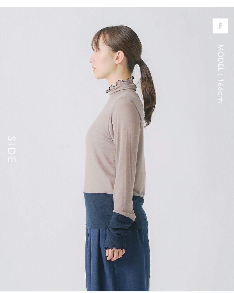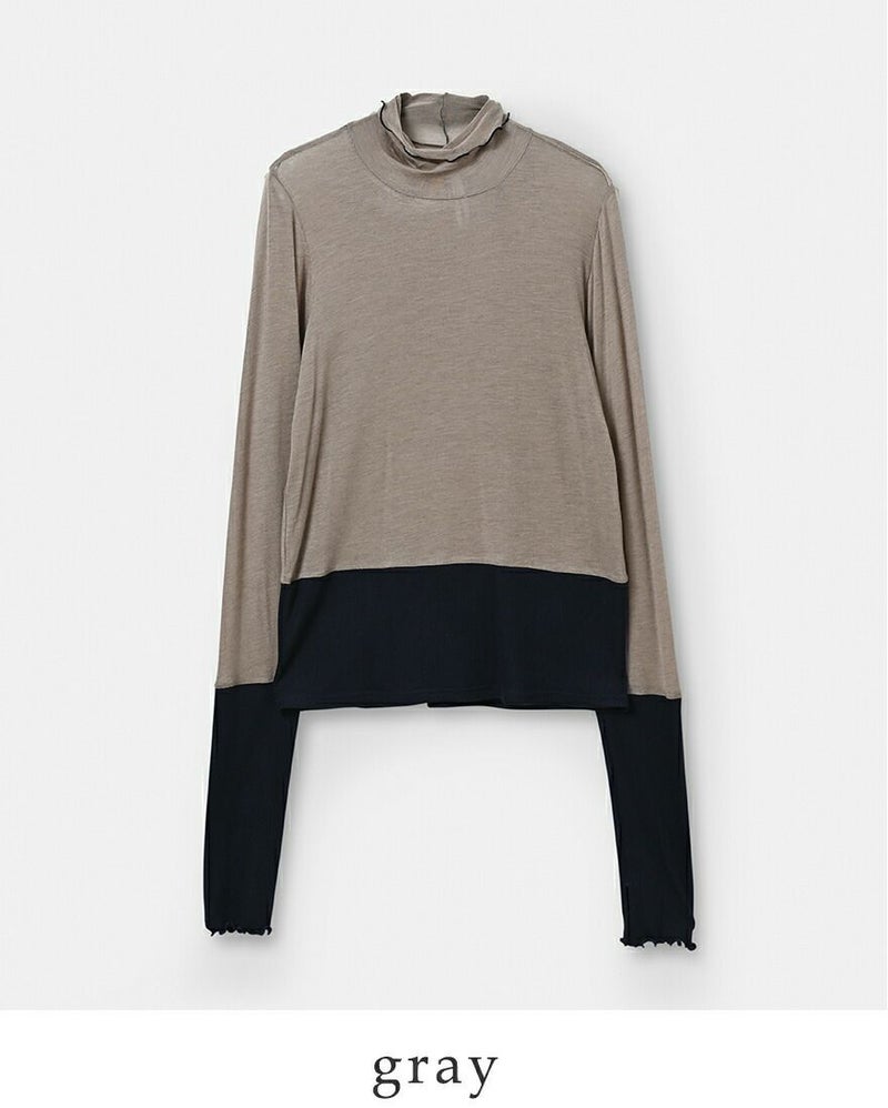 whyto(ホワイト)よりカシミヤ シルク カラー ブロック タートル ニット プルオーバー “cashmere silk color block turtle”のご紹介です。カシミア、シルクのタートルネックカットソーです。程良いシアー感がトレンドなスタイリングにマッチ。袖口と裾をバイカラーで変化を持たせています。柔らかく、ふわっと軽い雰囲気なのでレイヤードインナーに持ってきても重くなりすぎず程良いアクセントカラーとして使いやすいです。薄くて伸縮率も良いので、着心地の良さに定評のある素材です。