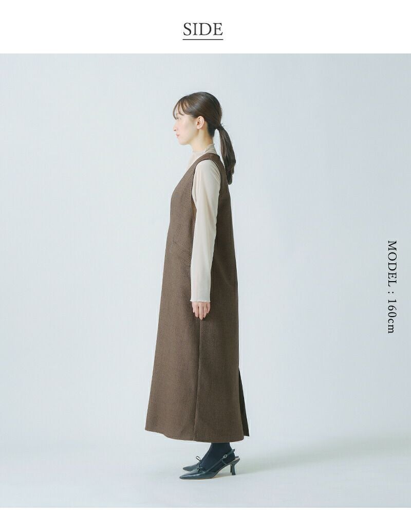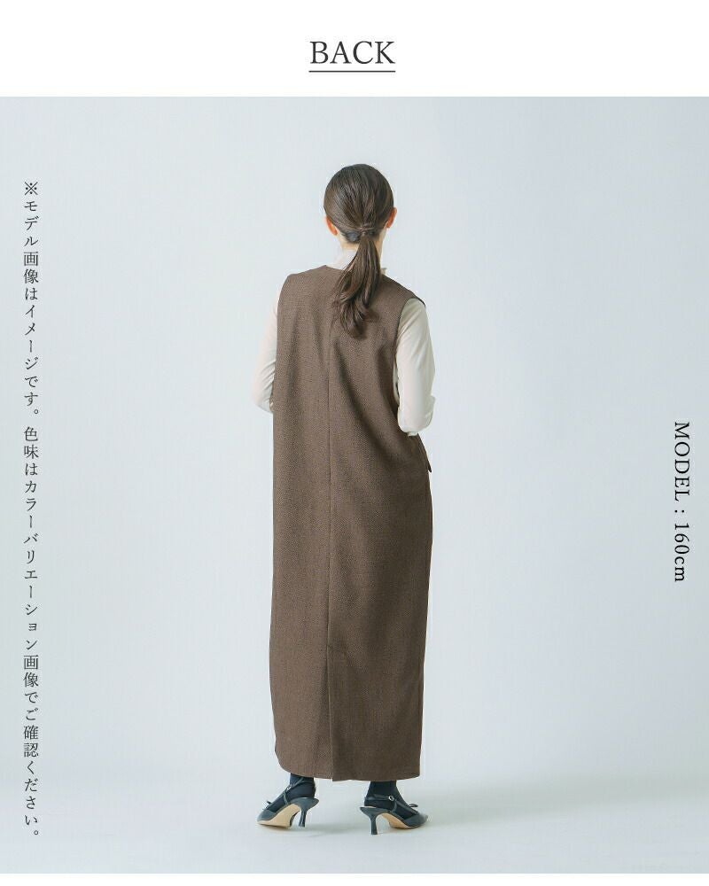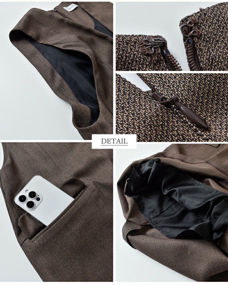 表面変化のある新素材ツイードを使用。多色の糸が織りなす立体感のある表情が特徴で、シンプルなシルエットに豊かな奥行きをプラスします。柔らかく程よいハリ感があり、上品な着心地と美しいドレープを実現。フォーマルシーンにも対応できる高級感のある仕上がりです。