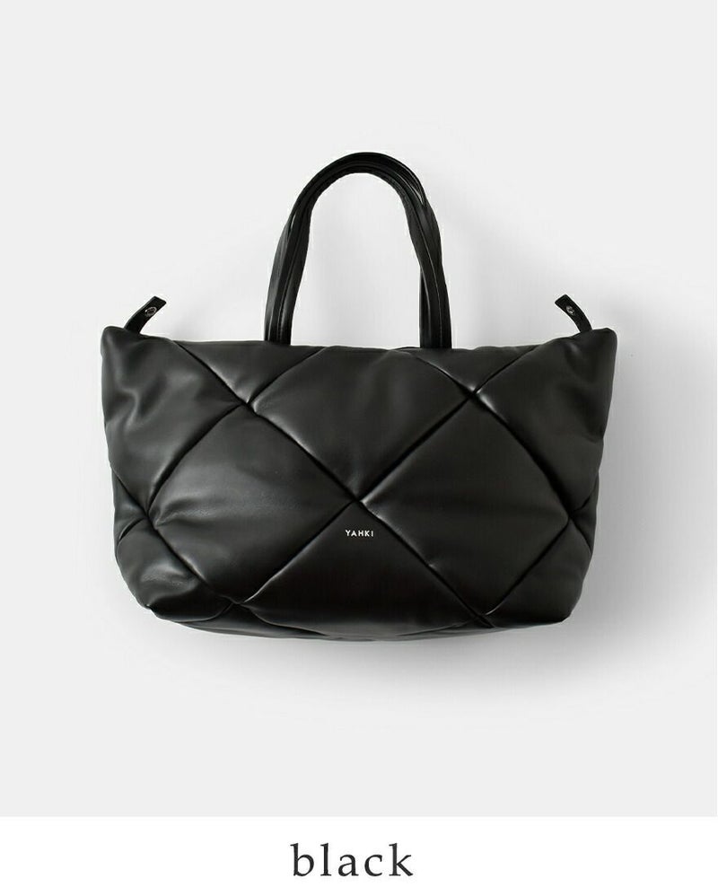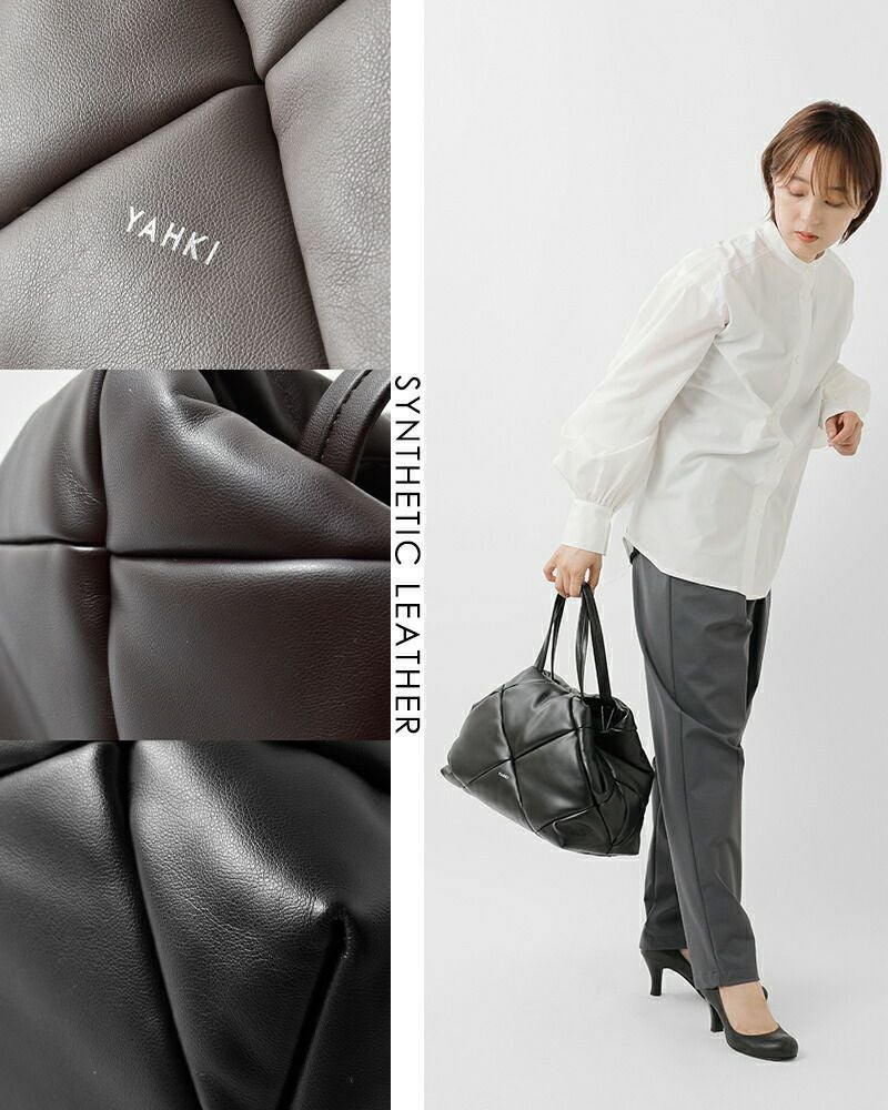 YAHKI(ヤーキ)よりシンセティックレザー 2way トートバッグのご紹介です。ふっくらとしたボリュームキルティングが印象的なフェイクレザートートバッグ。やわらかな艶感をまとった素材と中わた入りの軽やかなフォルムで、存在感がありながらも上品な雰囲気に仕上がっています。開口部はマグネットとスナップボタンの2段階仕様。荷物の量やシーンに合わせてフォルムを変えられるのも嬉しいポイントです。大きく開いて中身が見やすく、閉じればすっきりと台形シルエットに。A4サイズの書類や13インチPC、ポーチやボトルなども余裕で収まる頼れる大容量設計です。内ポケット付きで小物整理も快適。細めのハンドルは肩掛けしやすく、見た目以上に軽やかな使い心地を叶えます。デイリーから休日のお出かけまで、幅広いシーンで活躍する万能トートです。