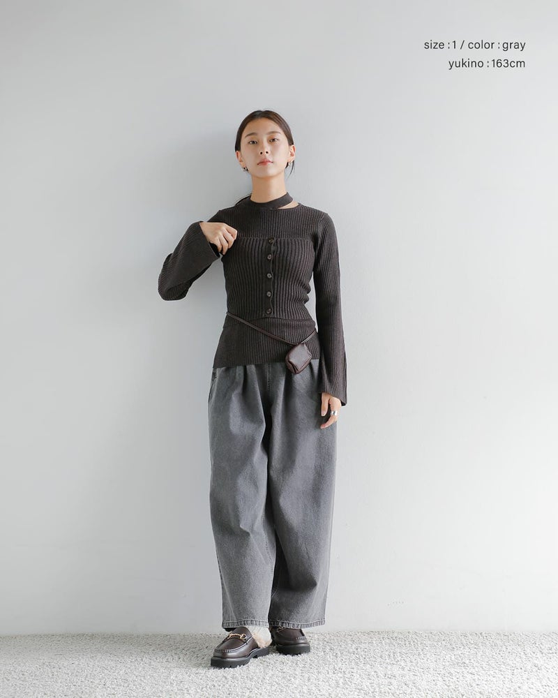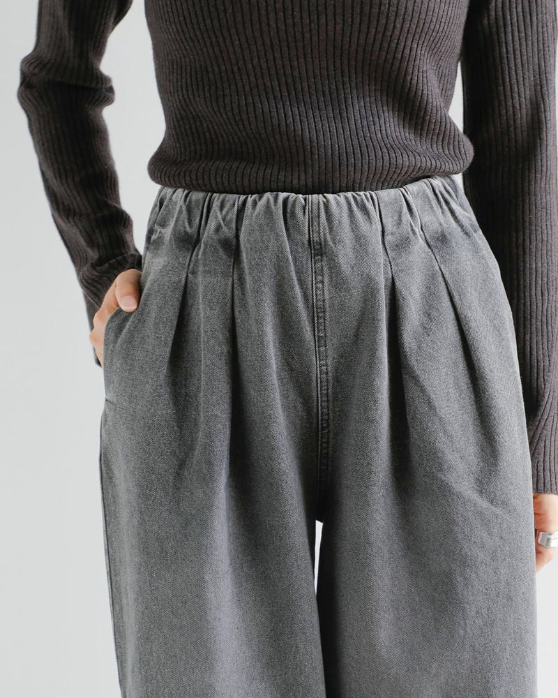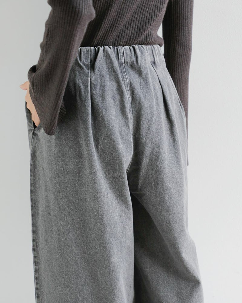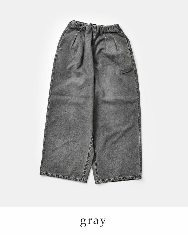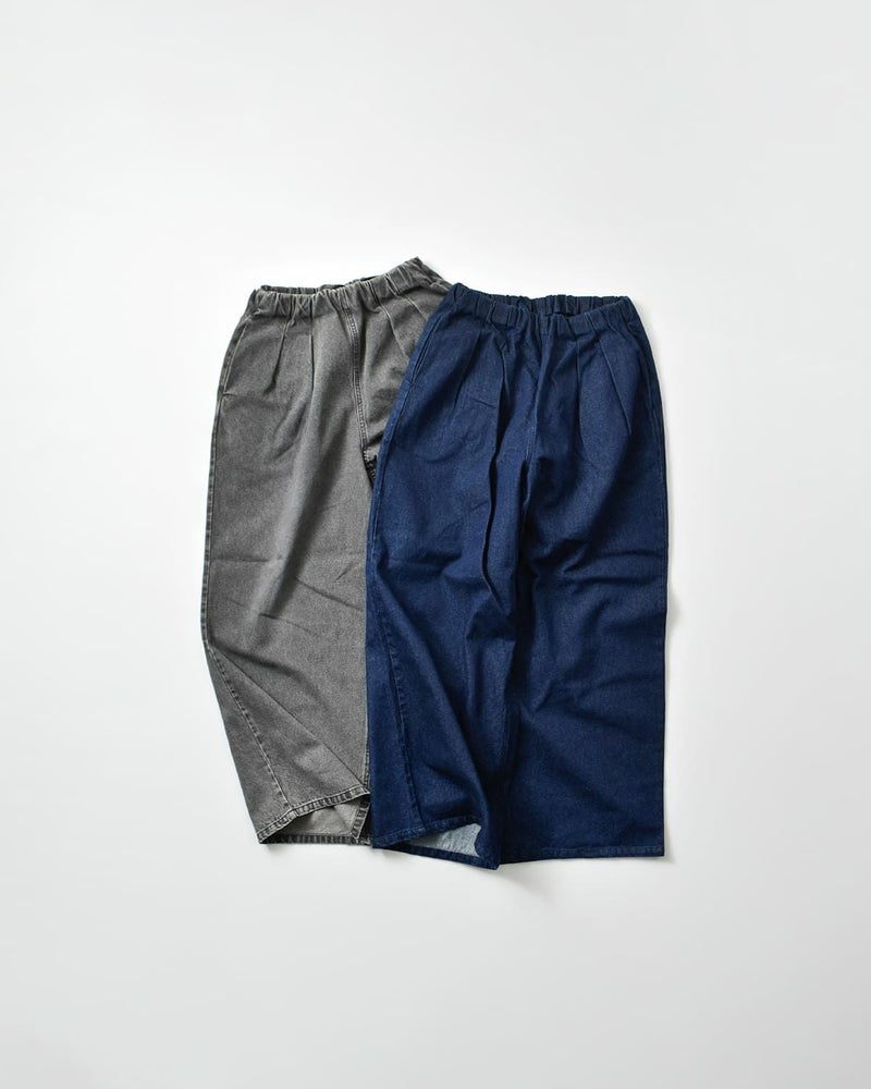 ギャザーとタックによって腰まわりにはゆとりを持たせつつ、縦のラインを強調することでスタイルアップ効果も期待できる一本。ウエストは内側のドロストコードで若干のサイズ調整が可能。インディゴはワンウォッシュ、グレーはケミカルウォッシュ+ブラスト加工を施し、それぞれ異なる表情に仕上げています。
