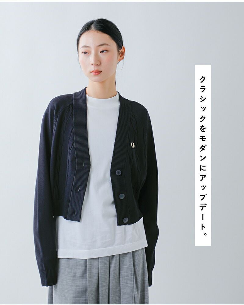 他の画像を見る 絶妙なバランスのショート丈とモダンな質感が魅力のVネックカーディガン 【40%OFF】FRED PERRY フレッド ペリー ケーブル ニット カーディガン “CABLE KNIT CARDIGAN” k1105 レディース 2025aw新作 ¥ 27,500 ¥ 16,500 税込 SALE SOLD OUT カートに入れる お気に入りに登録する