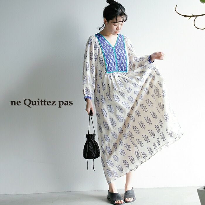 ne Quittez pas(ヌキテパ)より、コットン ボイル エスニック プリント ギャザー ドレス “Cotton Voile Ethnic Combination Print Gather Dress”のご紹介です。インド中央部の先住民族が描いたトライバルアート“ゴンド”にインスパイアされた色柄が視線を集めるエスニックドレス。大胆なモチーフ使いの3柄をミックスし、胸元をカラーパイピングで切り替えたデザインは「ヌキテパ」らしい色彩センスが際立つ1枚。