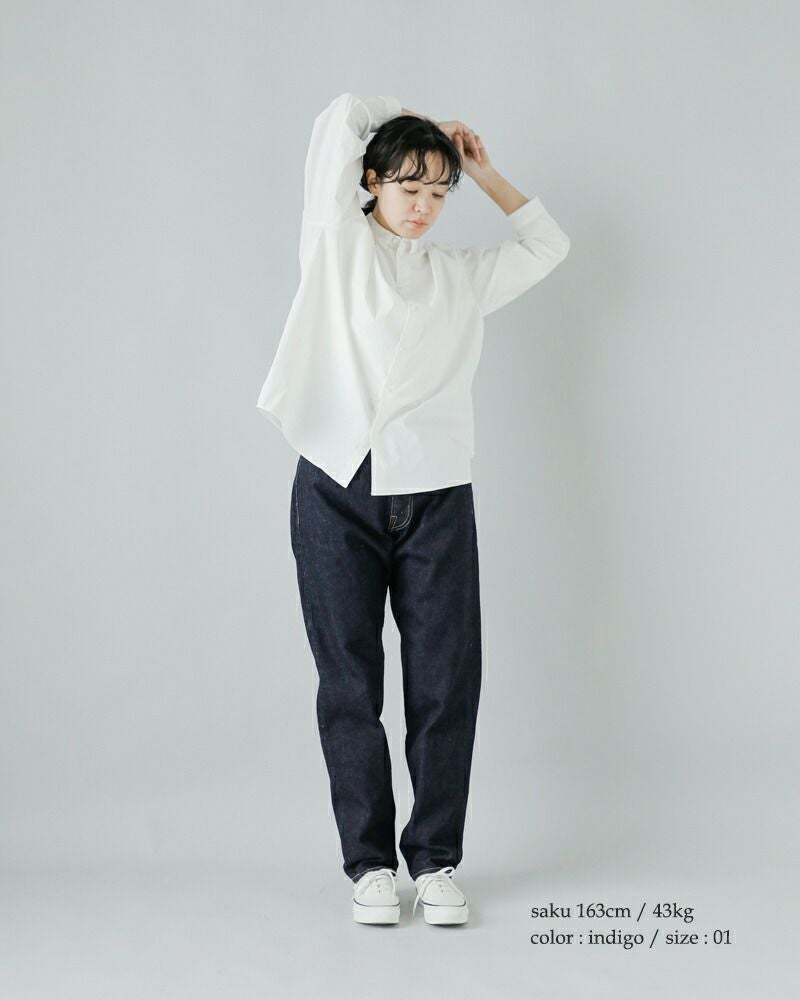 股上を深く取ったテーパードシルエットのジーンズ。ヒップから腰のラインまではゆったり、膝から下にかけてはきつめのテーパードといった、メリハリの利いた綺麗なバランスのジーンズです。