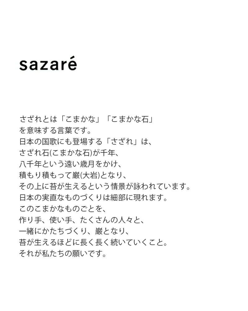 さざれとは「こまかな」「こまかな石」 を意味する言葉です。 日本の国歌にも登場する「さざれ」は、 さざれ石(こまかな石)が千年、 八千年という遠い歳月をかけ、 積もり積もって巌(大岩)となり、 その上に苔が生えるという情景が詠われています。 日本の実直なものづくりは細部に現れます。 このこまかなものごとを、 作り手、使い手、たくさんの人々と、 一緒にかたちづくり、巌となり、 苔が生えるほどに長く長く続いていくこと。 それが私たちの願いです。