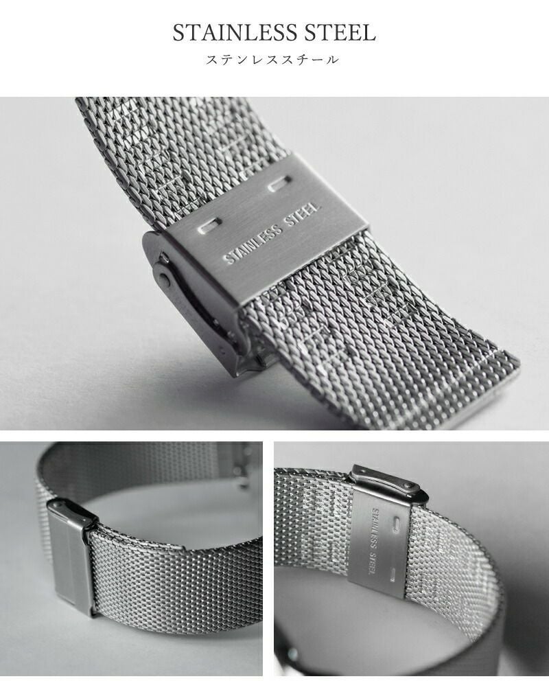 ステンレススチール編込み形状の、メッシュバンド。さり気なく輝くステンレスメッシュが抜群の存在感を放ちます。クールでスタイリッシュな印象のメッシュバンドをお好みの方におすすめです。