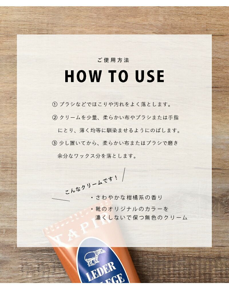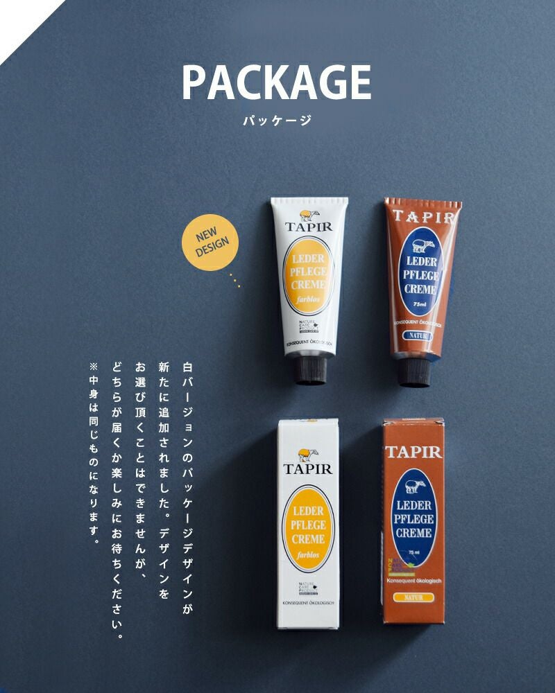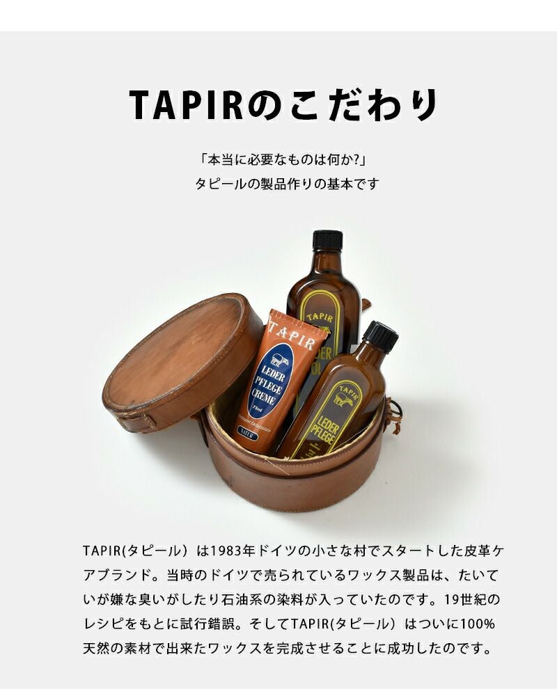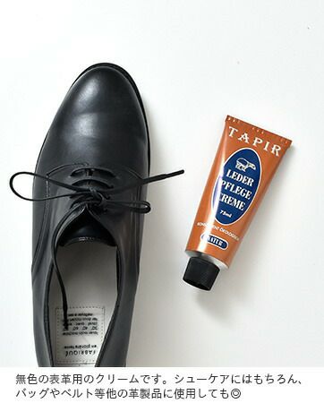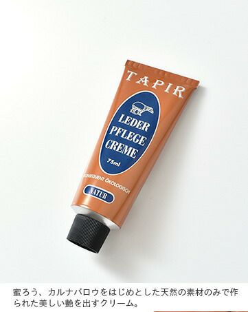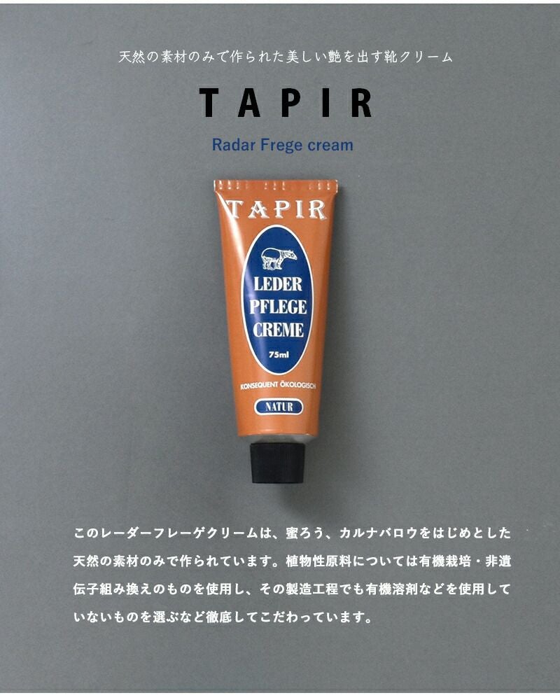 TAPIR(タピール)より、レーダーフレーゲクリーム のご紹介です。蜜ろう、カルナバロウをはじめとした天然の素材のみで作られたレーダーフレーゲクリームです。植物性原料については有機栽培・非遺伝子組み換えのものを使用し、その製造工程でも有機溶剤などを使用していないものを選ぶなど徹底してこだわっています。靴のオリジナルのカラーを濃くしないで保つ無色のクリーム。シューケアにはもちろん、バッグやベルト等他の革製品に使用しても◎。