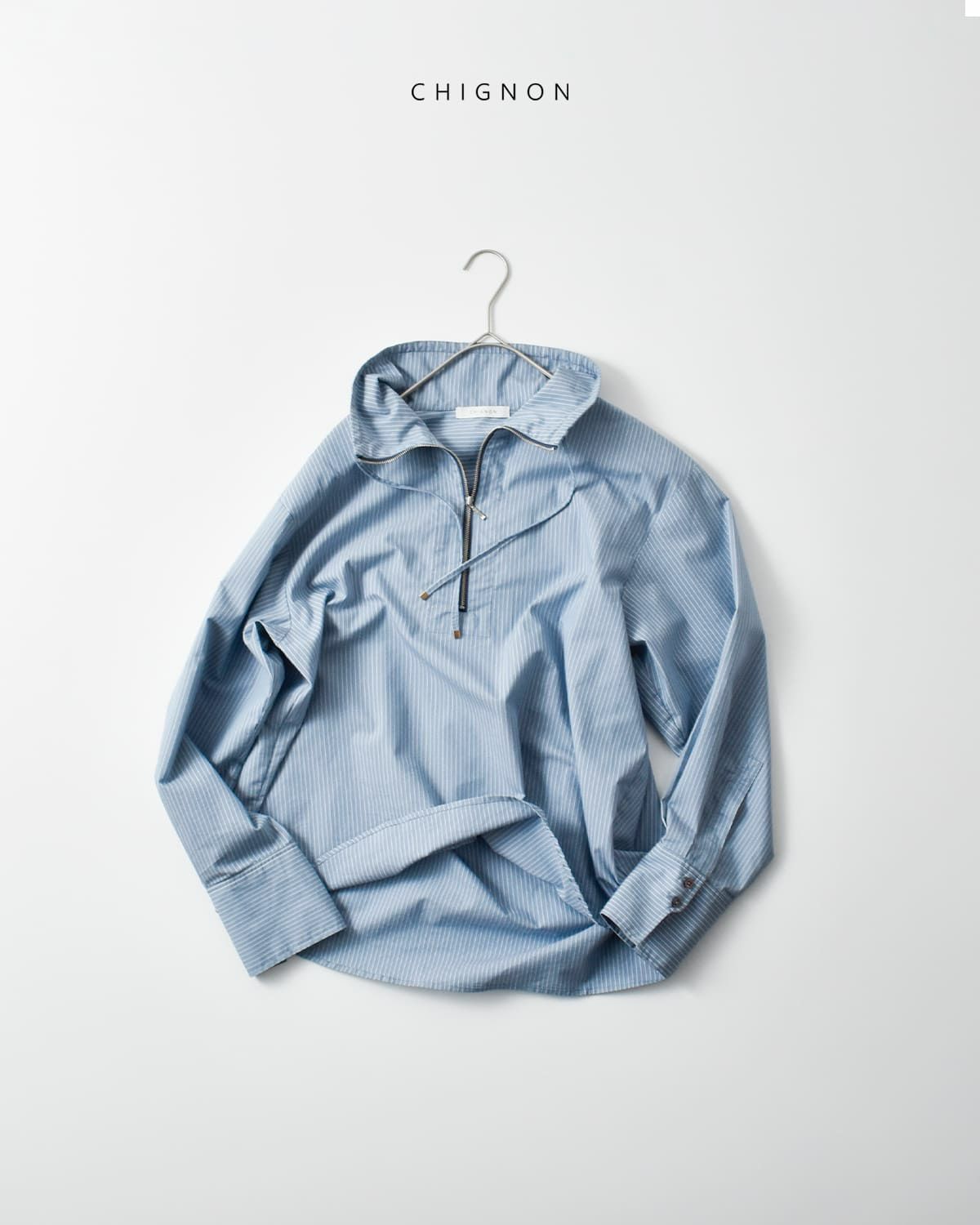 ストライプシャツアノラック変形カフストラッド抜け感大人カジュアル秋冬長袖スポーティデイリー 【20%OFF】CHIGNON シニヨン ストライプ アノラック シャツ 1854-058bz-kk レディース