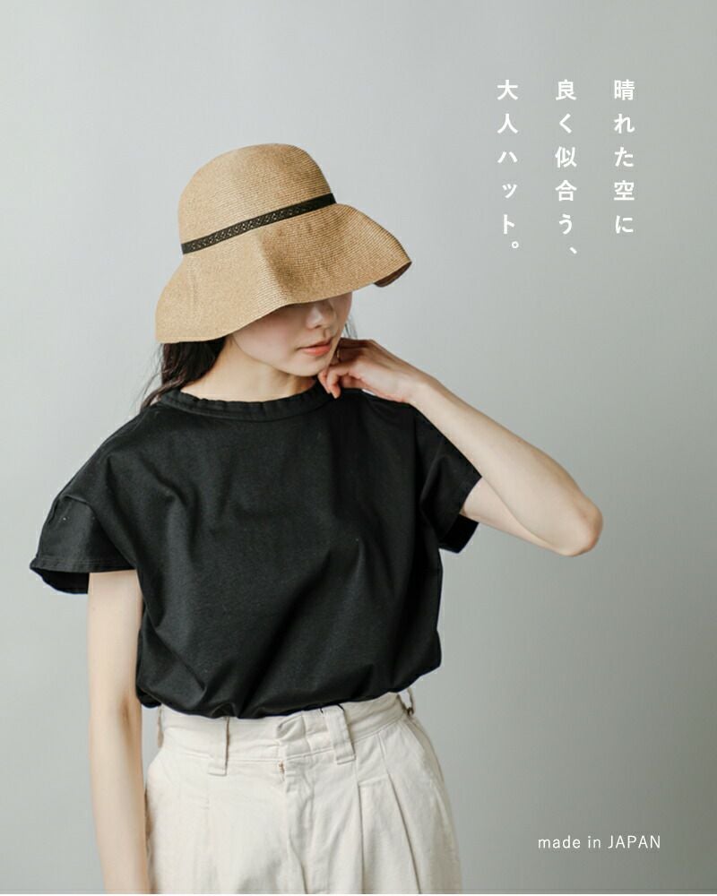 繊細なペーパーブレードで編まれた、ツバ広ハット。