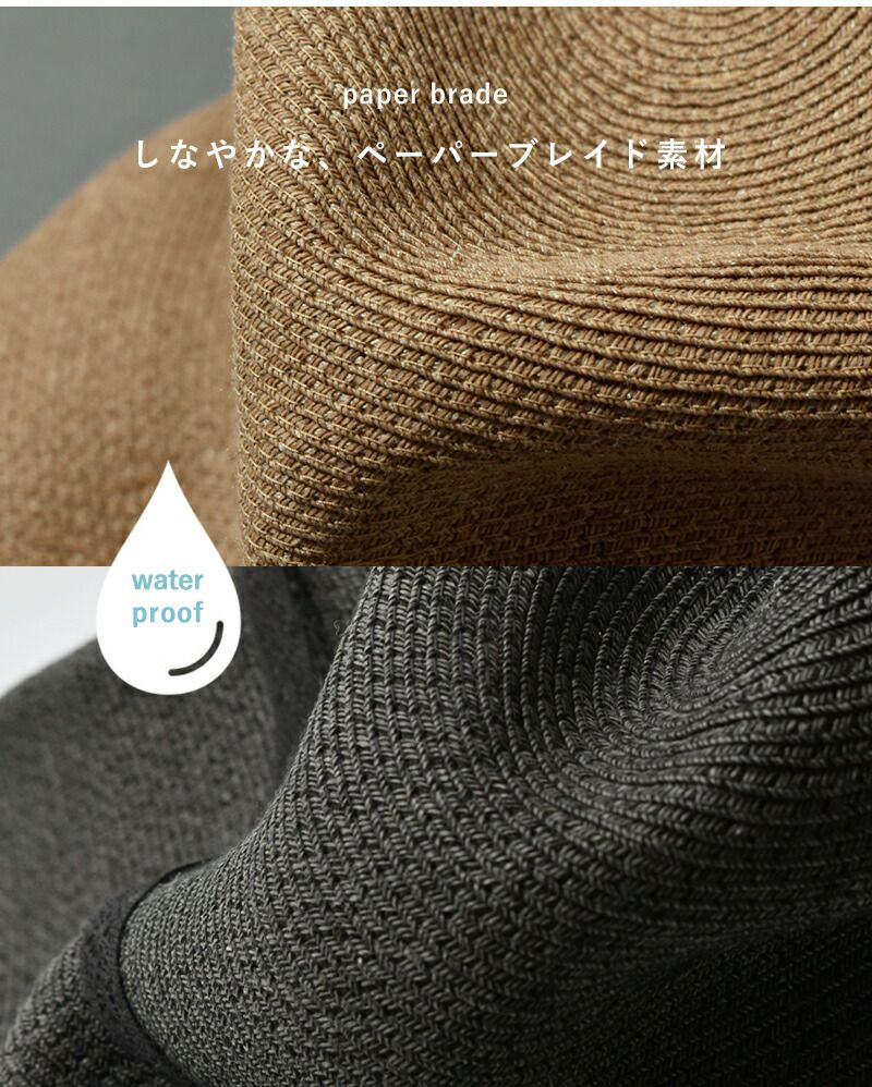ペーパーブレードハットはとても軽くしなやかで、型崩れがしにくく、縮み防止、汚れ防止効果があります。ナチュラルな風合いがあり通気性も良く、夏でも涼しくさわやかな被り心地。品の良い素材感で春夏に最適な帽子です。糸に撥水加工を施しているので、軽い雨にも対応します。※編み目があるため、レインハットではありません。