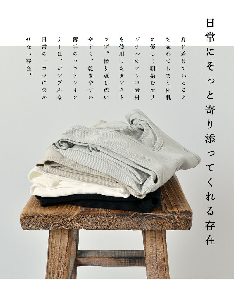 me.(ミードット)より、スーピマコットンリブテレコパッド付きタンクトップ のご紹介です。丸胴を利用したシームレスの仕様の胸パット入り付きのタンクトップです。素材には、細くやわらかな80/2のスーピマコットンを編み立てた伸びがよくフィット感もよい、オリジナルテレコ素材を使用。身に着けていることを忘れてしまう程肌に優しくなじみます。繰り返し洗いやすく、乾きやすい薄手のコットンインナーは、日常にそっと寄り添ってくれる存在になってくれますよ。
