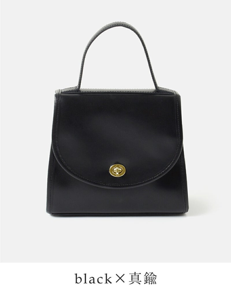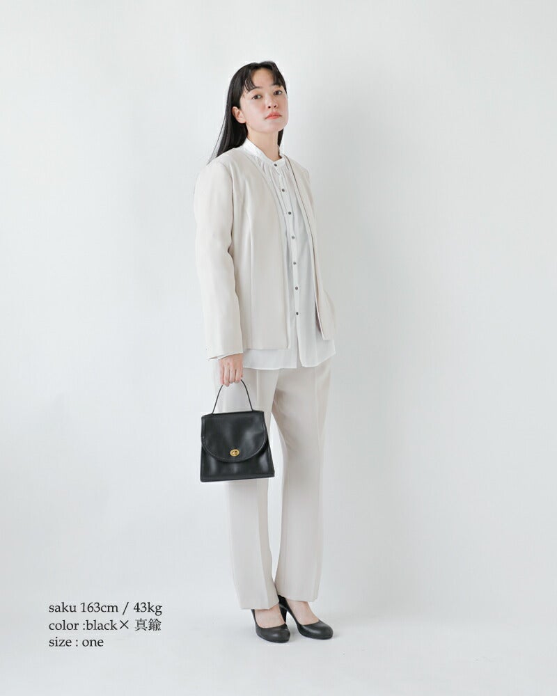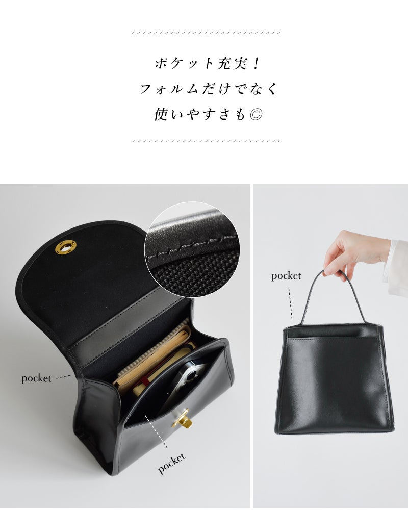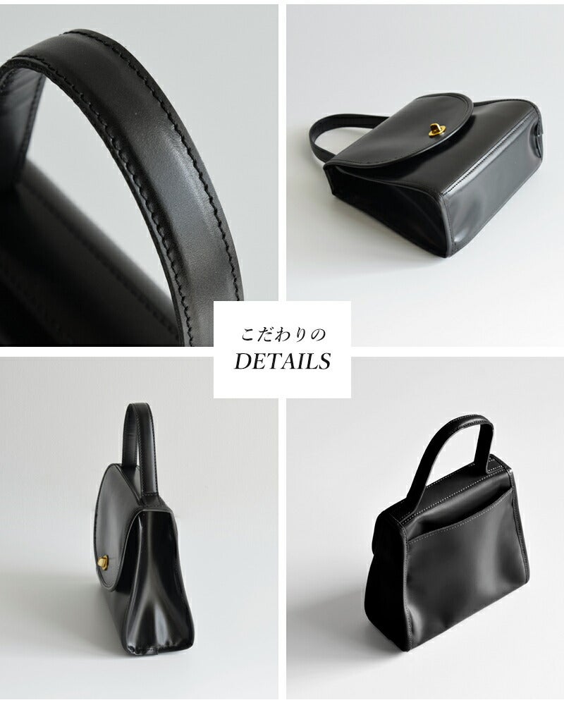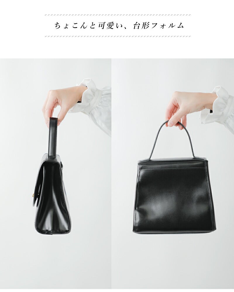 かっちりとした台形型のエレガントなハンドバッグ。ちょこんと小さなサイズ感が使いやすく、デイリーはもちろん、ちょっとしたお出かけにも丁度良いバッグに仕上がっています。無駄をそぎ落し、フォルムの美しさ・素材の上質さを最大限に引き出した美しいバッグです。