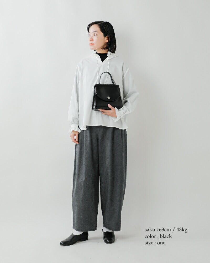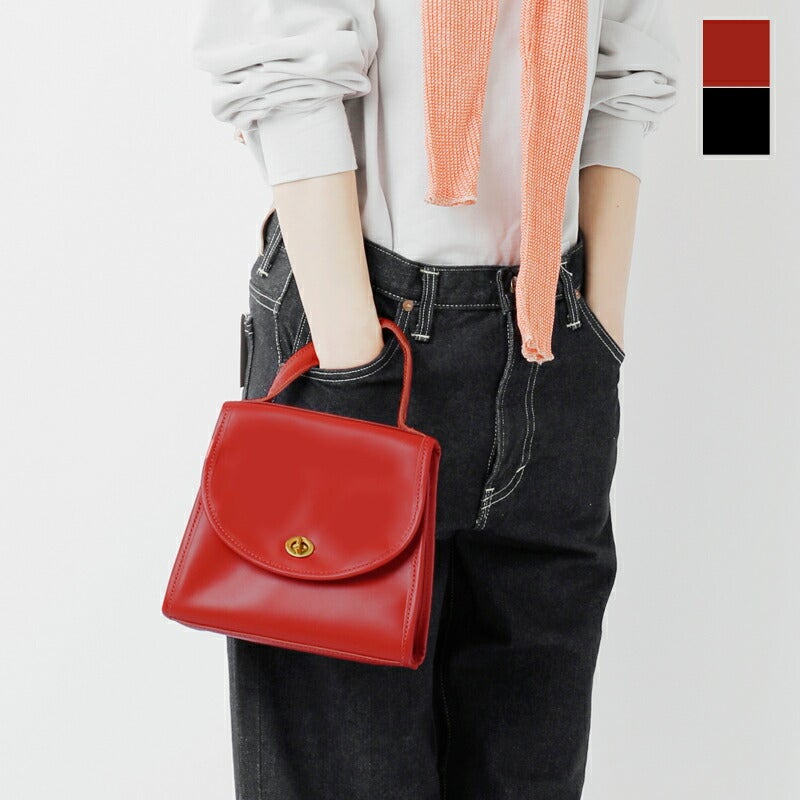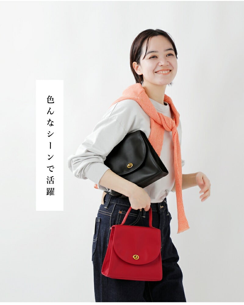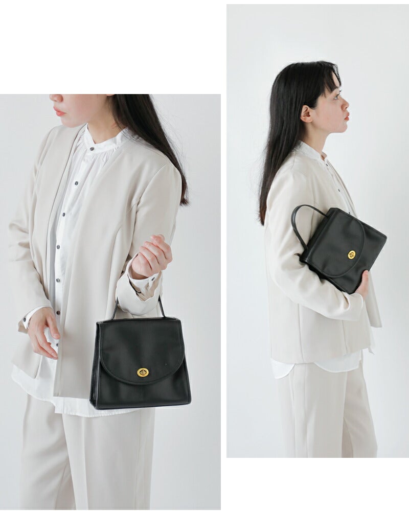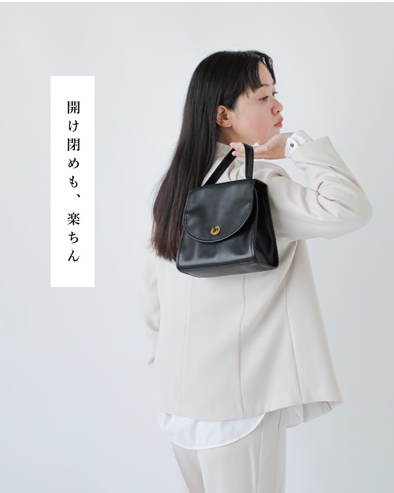 かっちりとした台形型のエレガントなハンドバッグ。ちょこんと小さなサイズ感が使いやすく、デイリーはもちろん、ちょっとしたお出かけにも丁度良いバッグに仕上がっています。無駄をそぎ落し、フォルムの美しさ・素材の上質さを最大限に引き出した美しいバッグです。