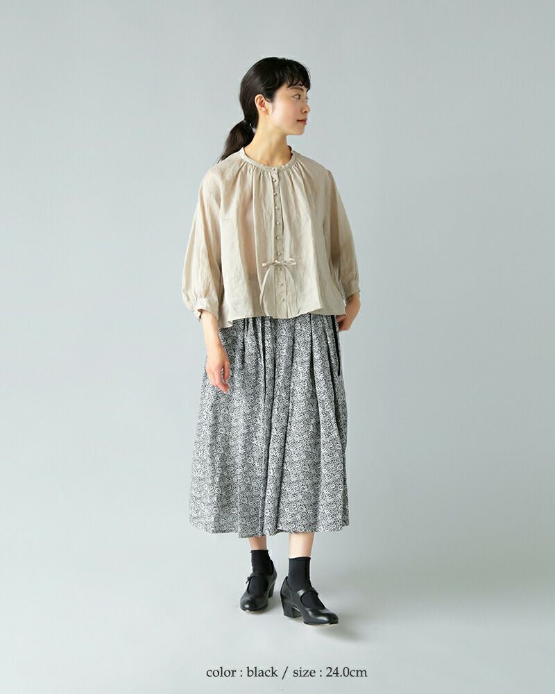 ぽってりとしたヒールから足首に向かってきゅっと締まった美しいフォルムとなり、後ろ姿も魅了します。少しだけ余裕を持たせたノーズによりスリムな印象を受けますが、ワイズは日本人に一番多いと言われるEワイズとなっています。人によっては履くときに少し狭さを感じるかもしれませんので、サイズに迷ったらスタッフが試着し、 オススメサイズをご提案致します。