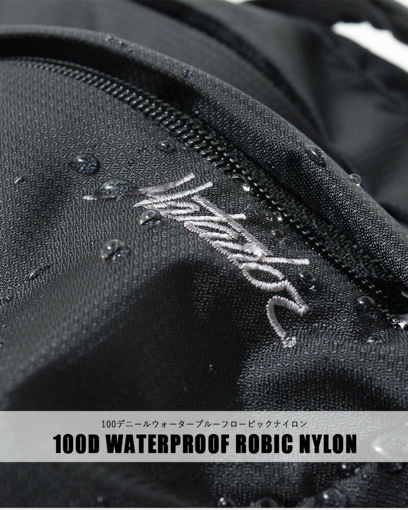 従来のPUコーティングに比べて引き裂き強度を30%アップさせるUTSコーティングを施した“100D waterproof Robicナイロン”を採用しており、耐摩耗性が高く、劣化しにくいうえ、防水性も備えているのが特徴で、街中での使用に耐えうる耐久性を実現しました。急な雨でも中の荷物を濡らすことなく収納しておくことができるのは嬉しいポイント◎フロントのブランドロゴ刺繍がアクセント。