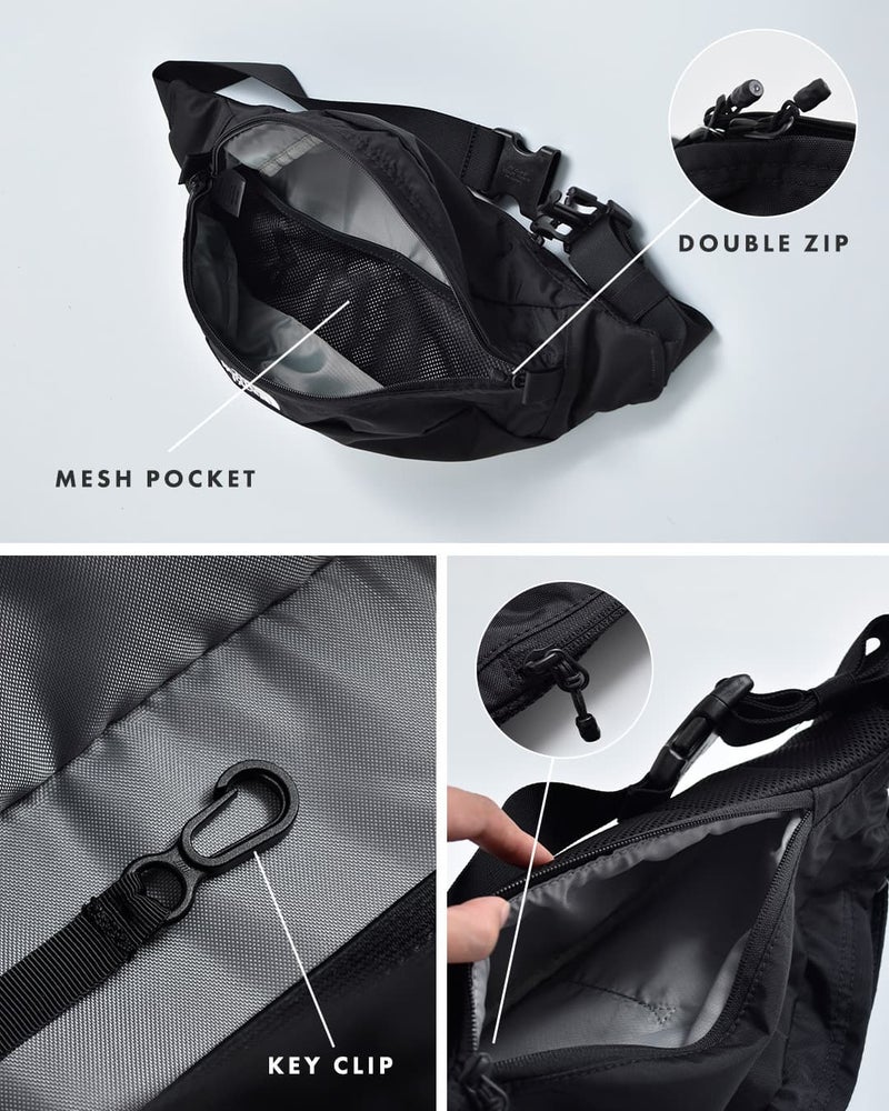 メインの収納部は広いつくりで、4Lの荷物を収納可能。中にはキークリップと、メッシュポケットを2か所装備しています。スライダーはつまみやすい形状で、ダブルジップで大きく開くことが出来ます。メインの収納とは別に、背面側にもスリムな収納スペース付き。