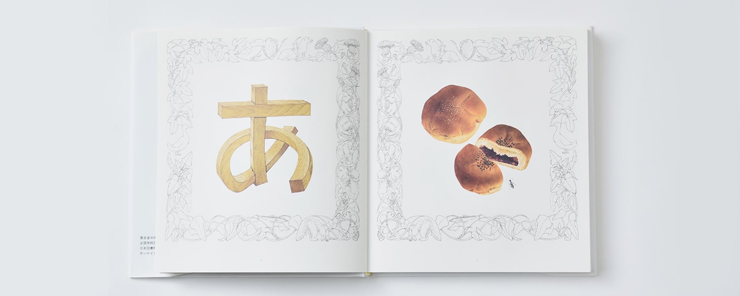 そして何より注目してほしいのはひらがなやモチーフをぐるりと囲んだ飾り枠。よくよく見るとその中にもそのページのひらがなで始まる植物や生き物や道具がちりばめられています!それも手書きとは思えないような緻密さと完璧な配列で。このアート作品のような見開きが50音、総ページ数でいうと104ページ(!)もあって、その仕事ぶりにはただただ感動してしまいます。これは少しコスパが良すぎるのでは..と心配になるほどです。