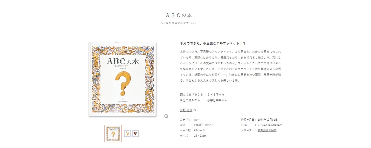 作者は画家・絵本作家の安野光雅さん。昨年12月24日に94歳でお亡くなりになりました。直前の秋ごろまで仕事を続けられていたそうで、著作物を調べると絵本だけでも沢山出てきます。小さいころに幼稚園で見ていただまし絵の本の作者である事も最近になり知りました。どれもきれいで不思議で、少し怖いけどなんだか楽しい、大人も子供も惹きつけられる魅力ある絵本だとおもいます。古いものは入手困難なものも多そうですが、今後見かけた場合はぜひ手にとって見ようと思います。まずはアルファベットバージョンである「ABCの本」をネットでぽちり。