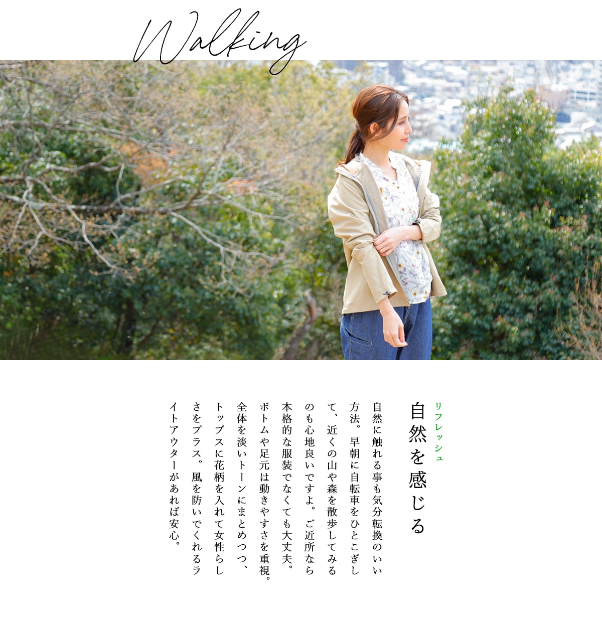 山歩きや自転車に乗っている時に困るのが急な雨や風。薄くて軽く、防水機能に優れたアウターは一枚あるととても便利。アウトドアブランドからスタイリッシュなアイテムがたくさんリリースされていて、普段の装いにも合わせやすいですよ。