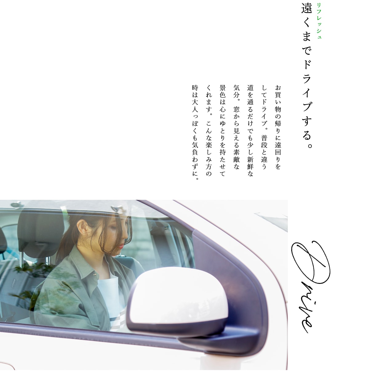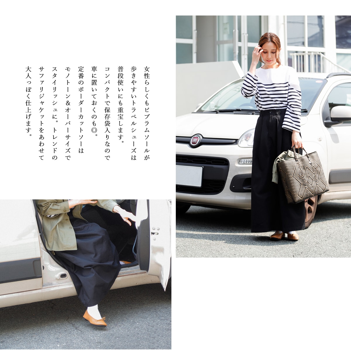 ふと見つけたお店に入ってショッピングをしたりとドライブには寄り道が付きもの。そんな時にはたっぷり入るトートバッグが重宝します。横幅よりもマチがしっかりあるものを選ぶのがポイント。キャンバスやジュートなど素材で季節を出すとコーディネートが映えます。
