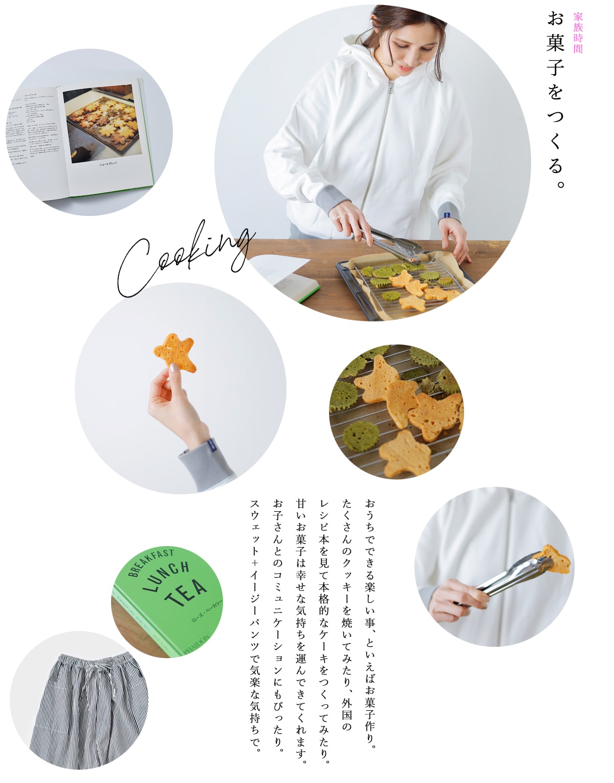 意外と身体を動かすことが多いお菓子作りにはやっぱりスウェットが楽ちん。ベーシックなデザインのものはサイズアップして少しゆったりめを選ぶとこなれ感が出るので、そのまま外出もOKです。