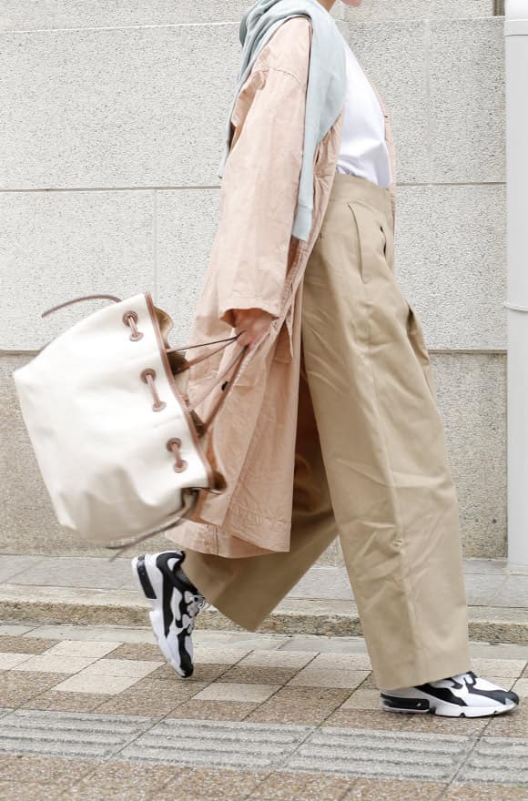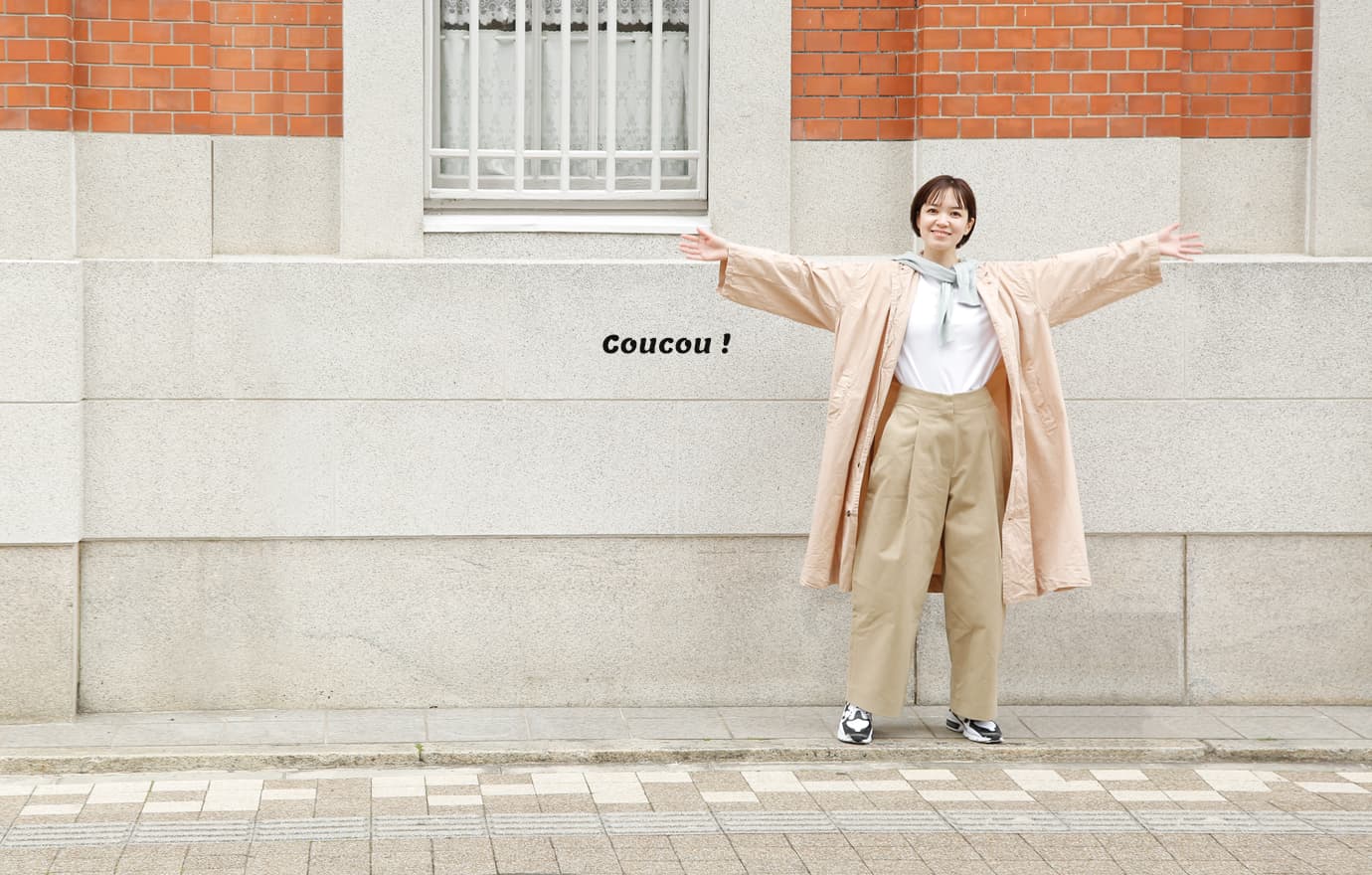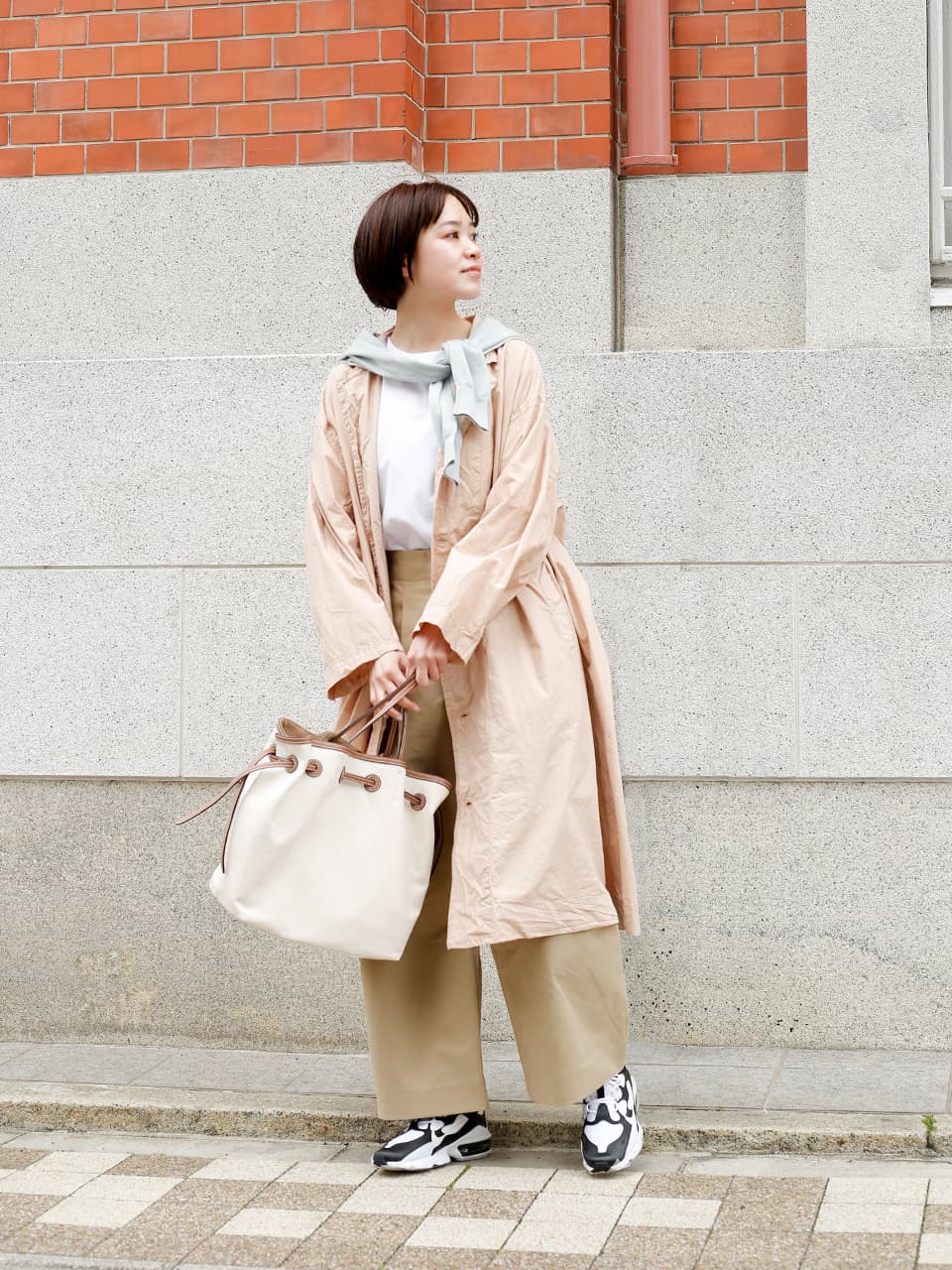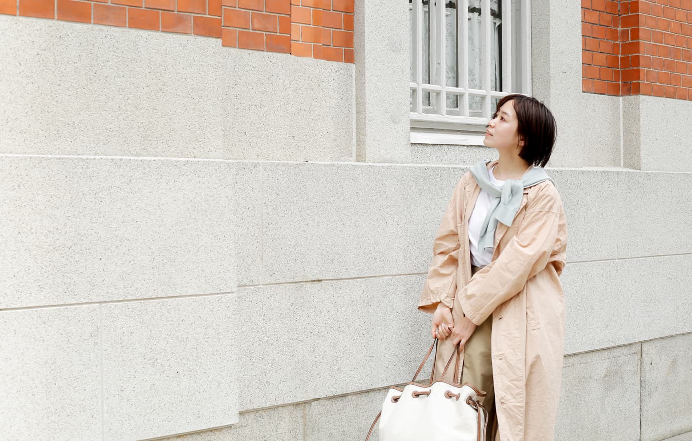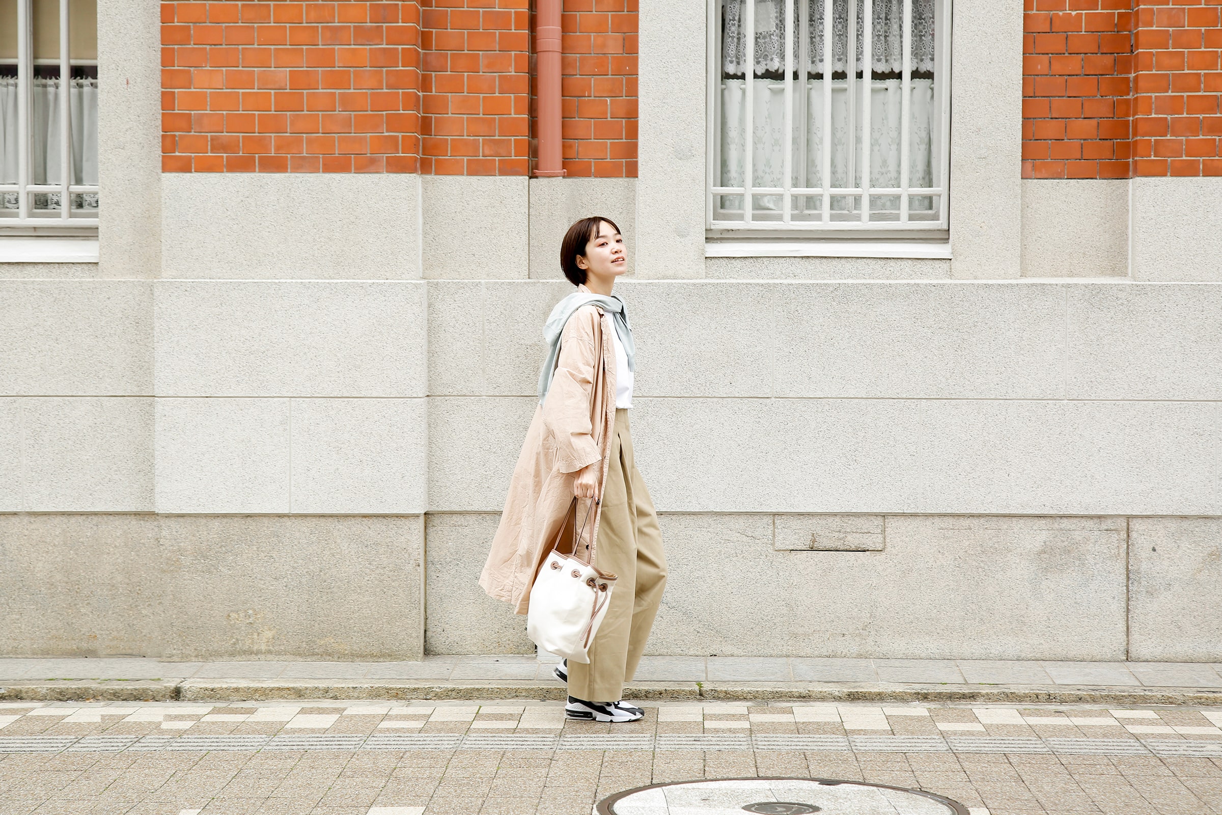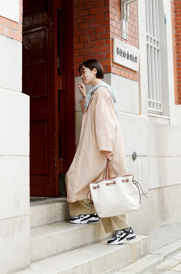 レトロな近代建築を探してぶらり散策。ふわりとしたビッグサイズのコートや肩に巻いたカーディガンなどさりげなくペールトーンを入れて春らしく。長く歩いても疲れないよう足元は軽快なスニーカーで行きましょう。実は近所に素敵な建築があるかも!?