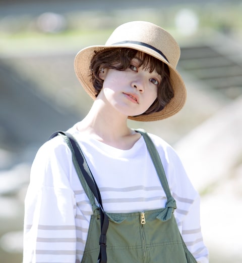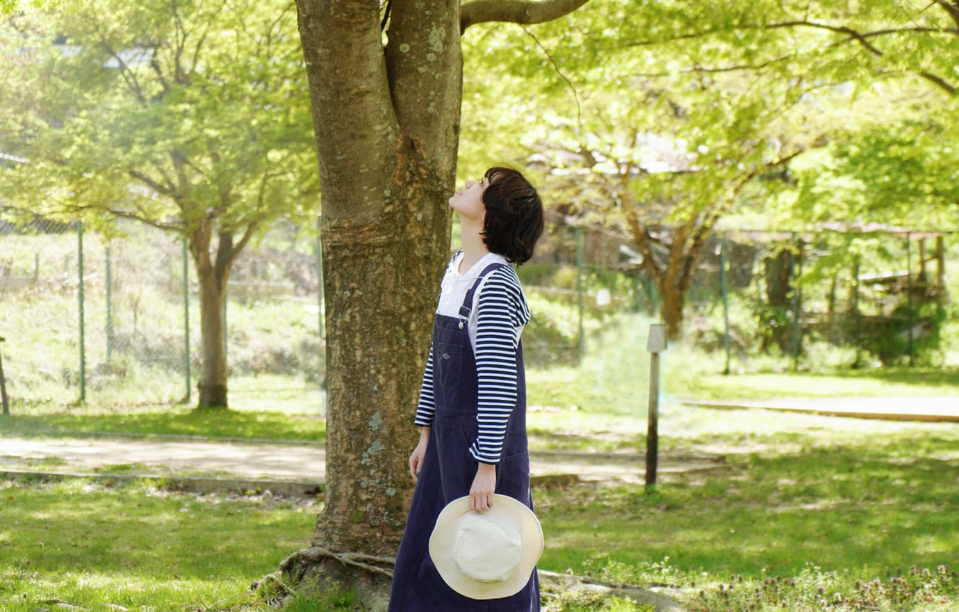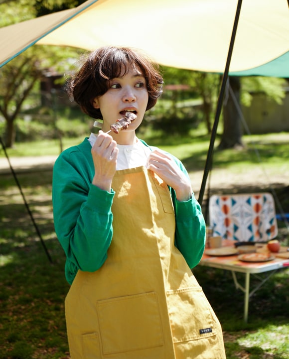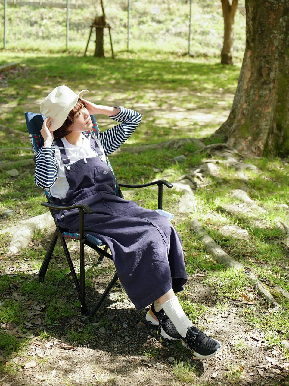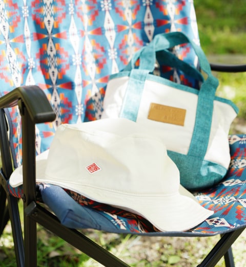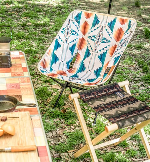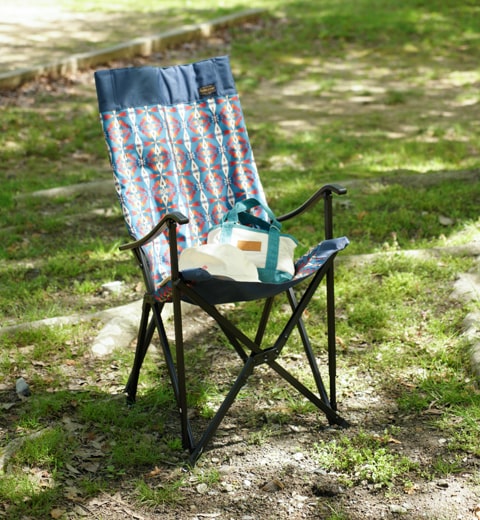 持ち運びのできるチェアがあれば、お気に入りの場所を選んで木漏れ日のなかで読書やお昼寝をしてみるのもいいかも。シンプルなTシャツにジャンパースカートを合わせてゆったり心地よく。PENDLETONのチェアはお家でもインテリアとして映えるスグレモノ。長い時間を楽しむなら大きめを選ぶのがおススメ。